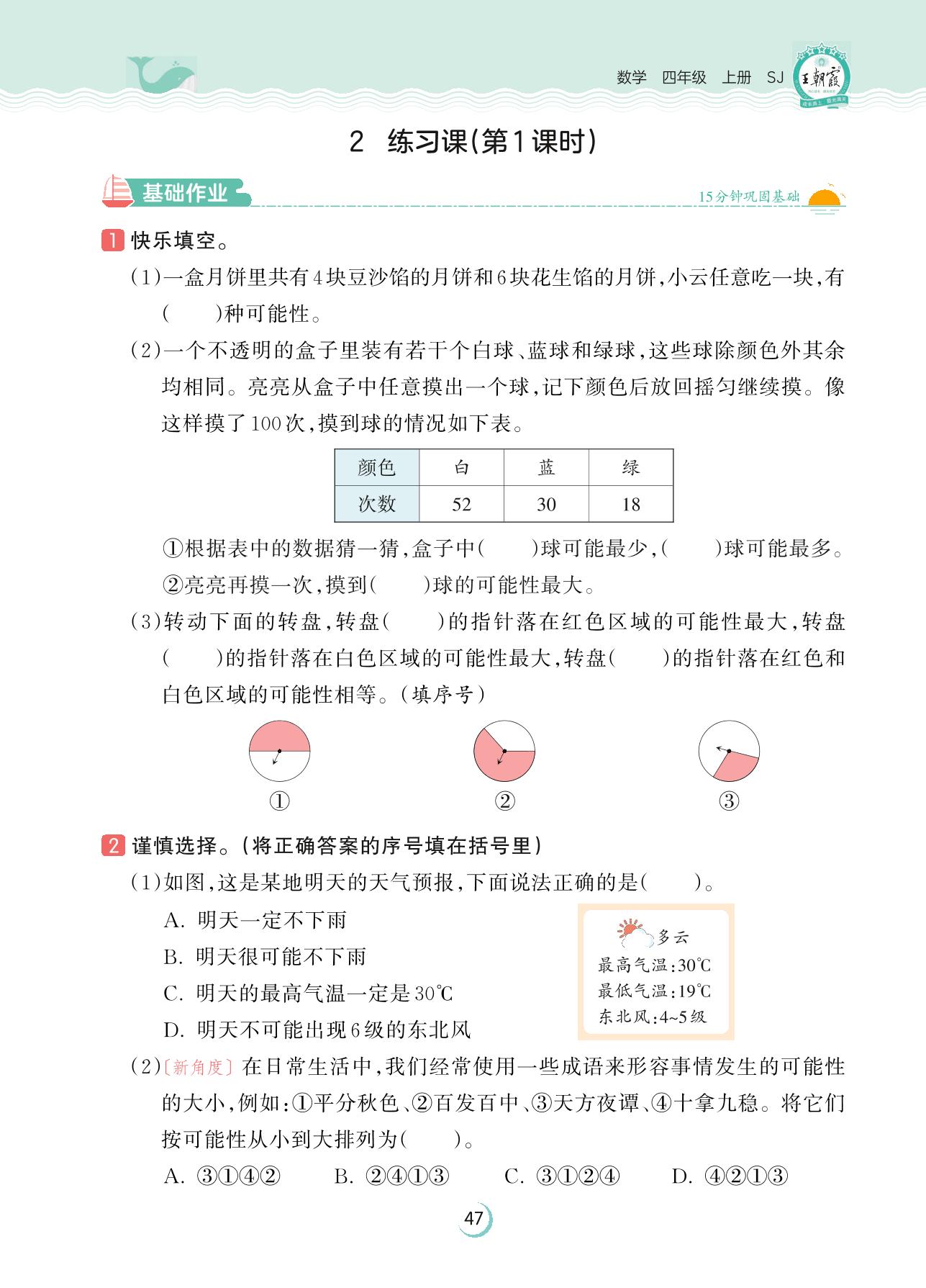 2023上册四年级数学苏教版 第六单元 可能性——2 练习课(第1课时)