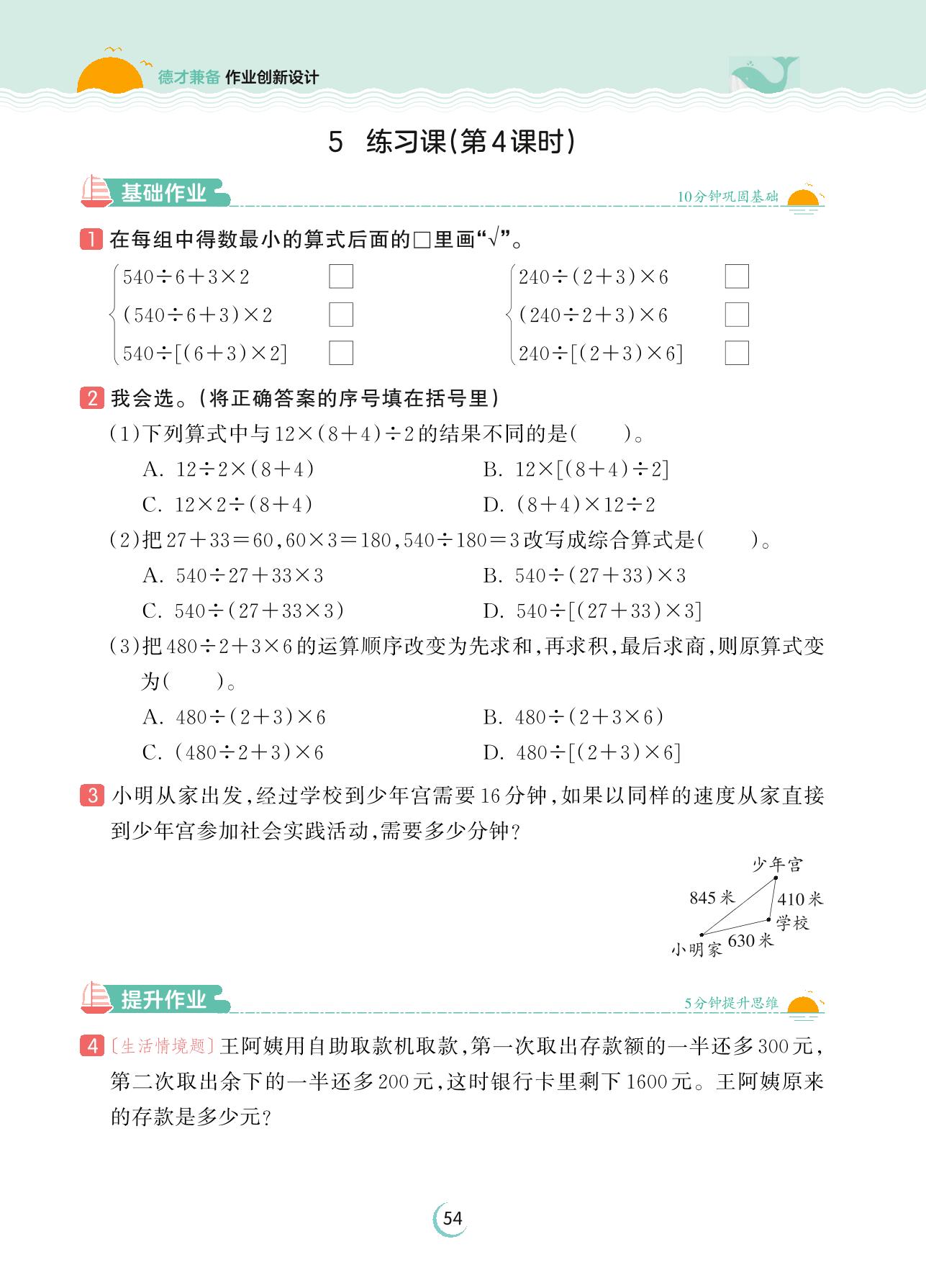 2023上册四年级数学苏教版 第七单元 整数四则混合运算——5 练习课(第4课时)