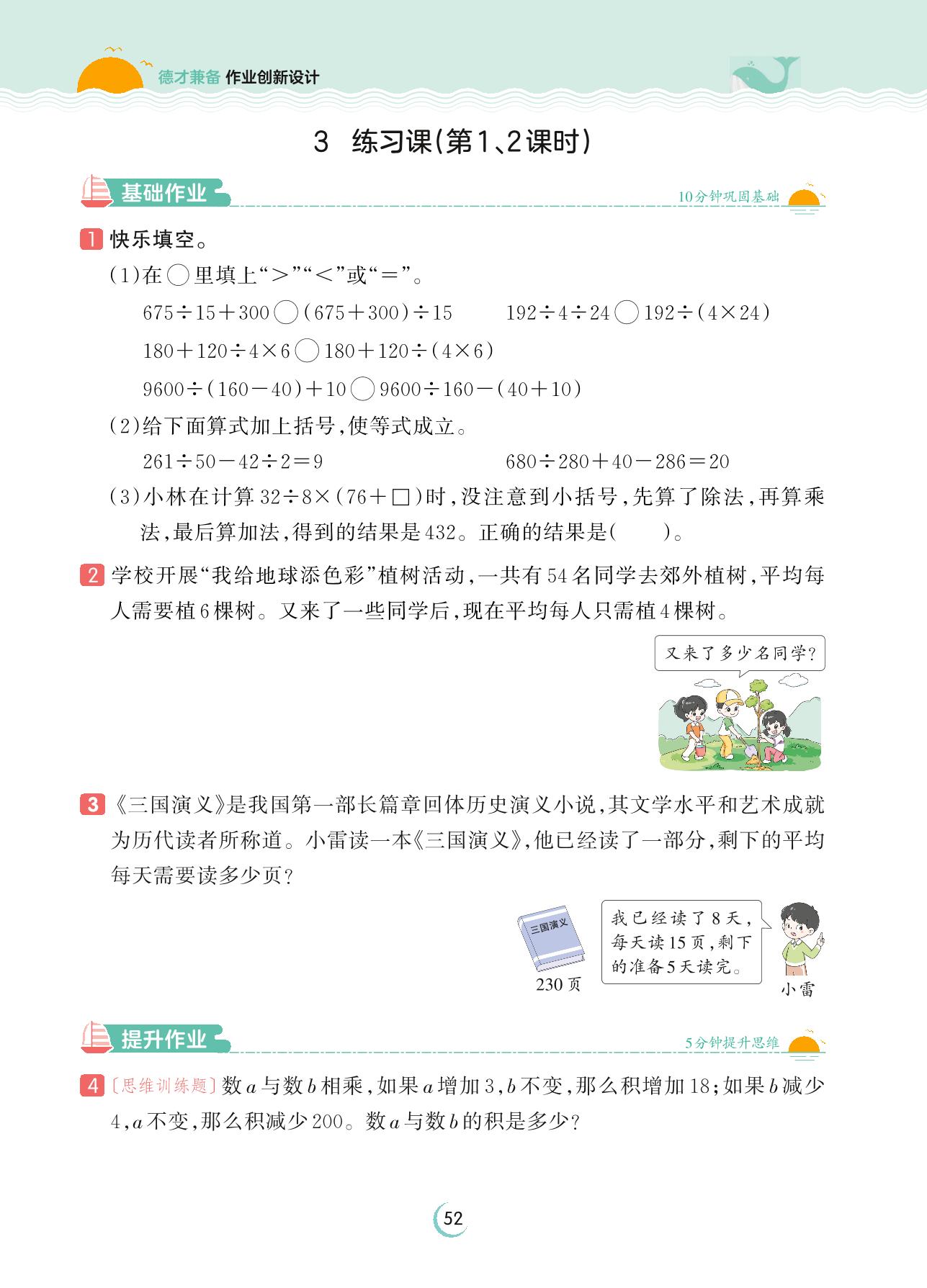 2023上册四年级数学苏教版 第七单元 整数四则混合运算——3 练习课(第1、2课时)