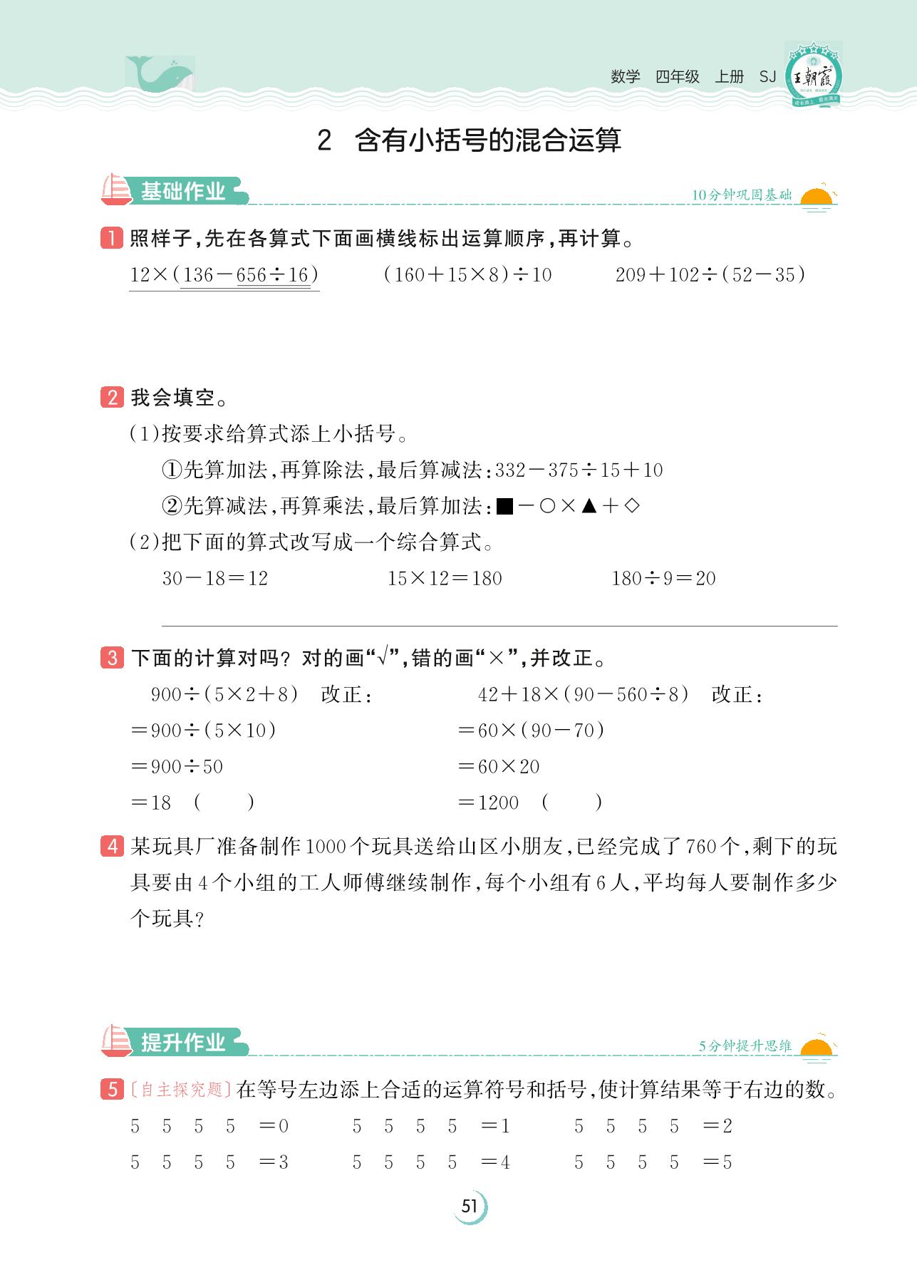2023上册四年级数学苏教版 第七单元 整数四则混合运算——2 含有小括号的混合运算