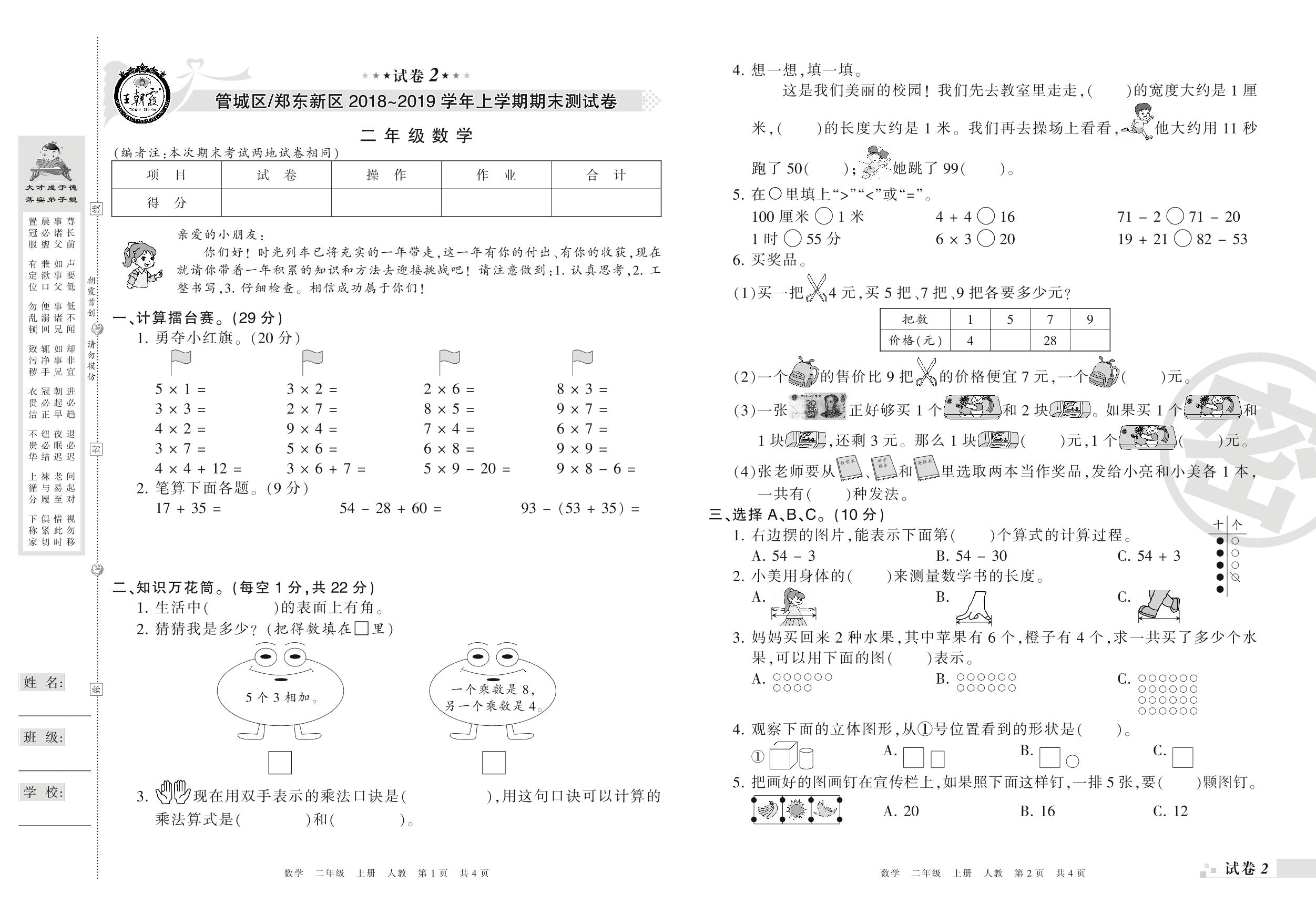 2018-2019学年第一学期郑州市管城区、郑东新区二年级数学试卷(人教版)【2】