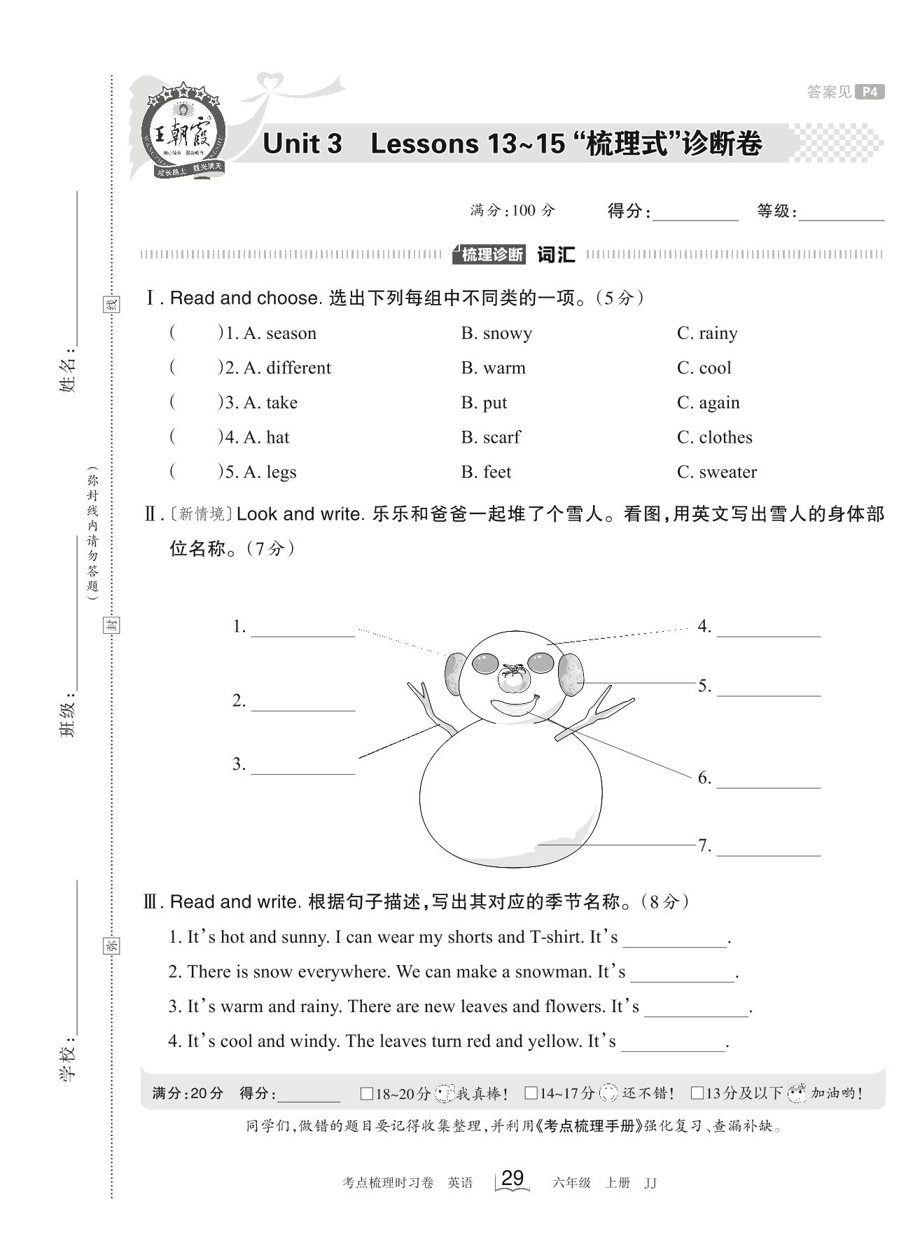 2023上册六年级英语冀教版 Unit 3 Lessons 13~15 “梳理式”诊断卷