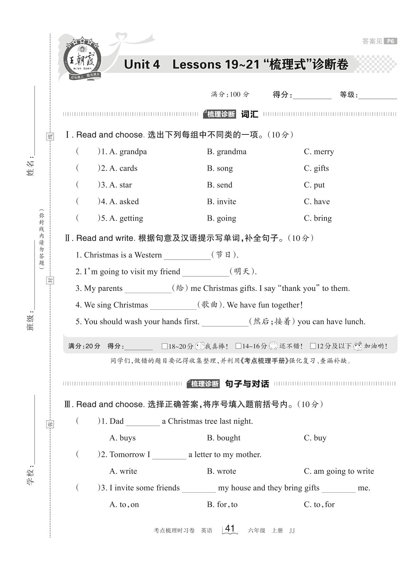 2023上册六年级英语冀教版 Unit 4 Lessons 19~21 “梳理式”诊断卷