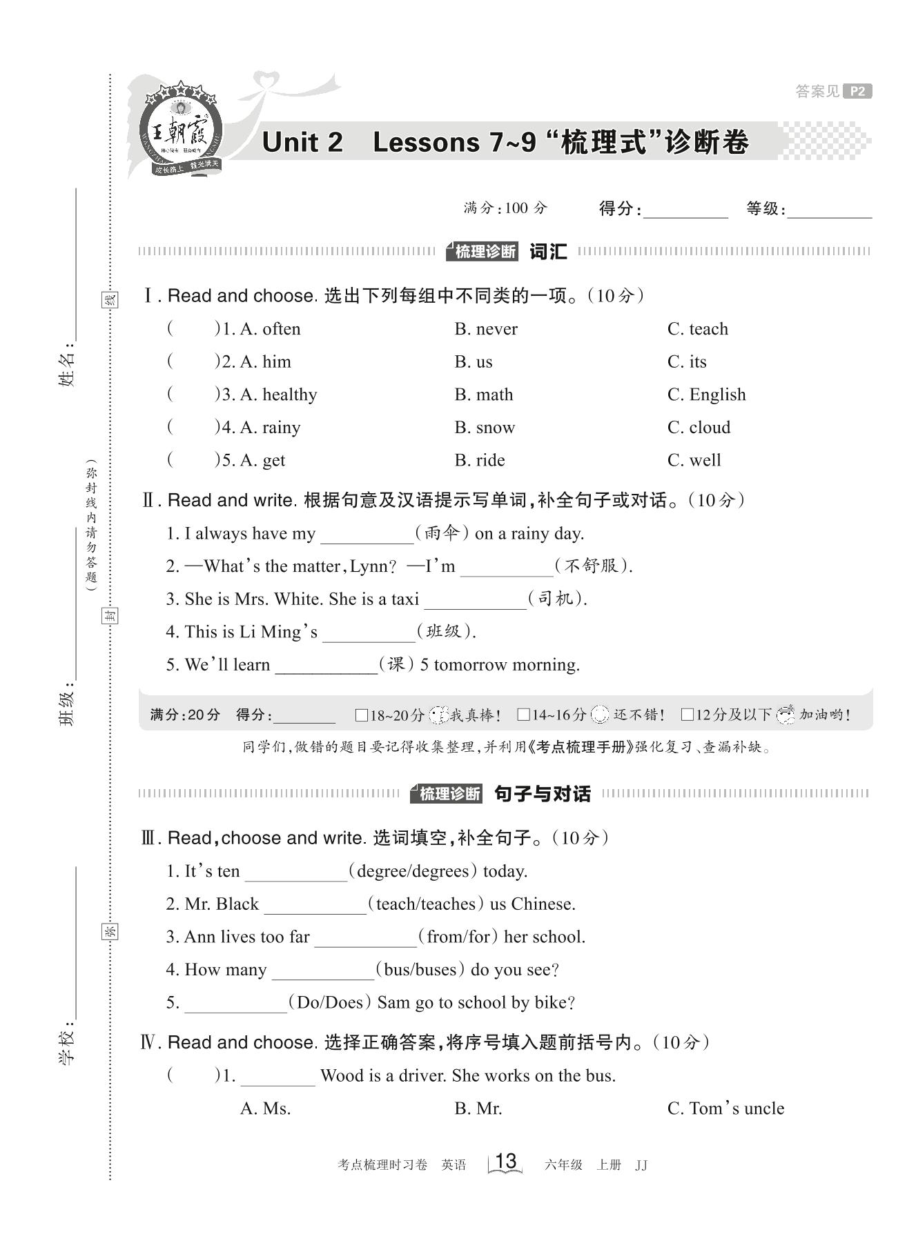 2023上册六年级英语冀教版 Unit 2 Lessons 7~9 “梳理式”诊断卷