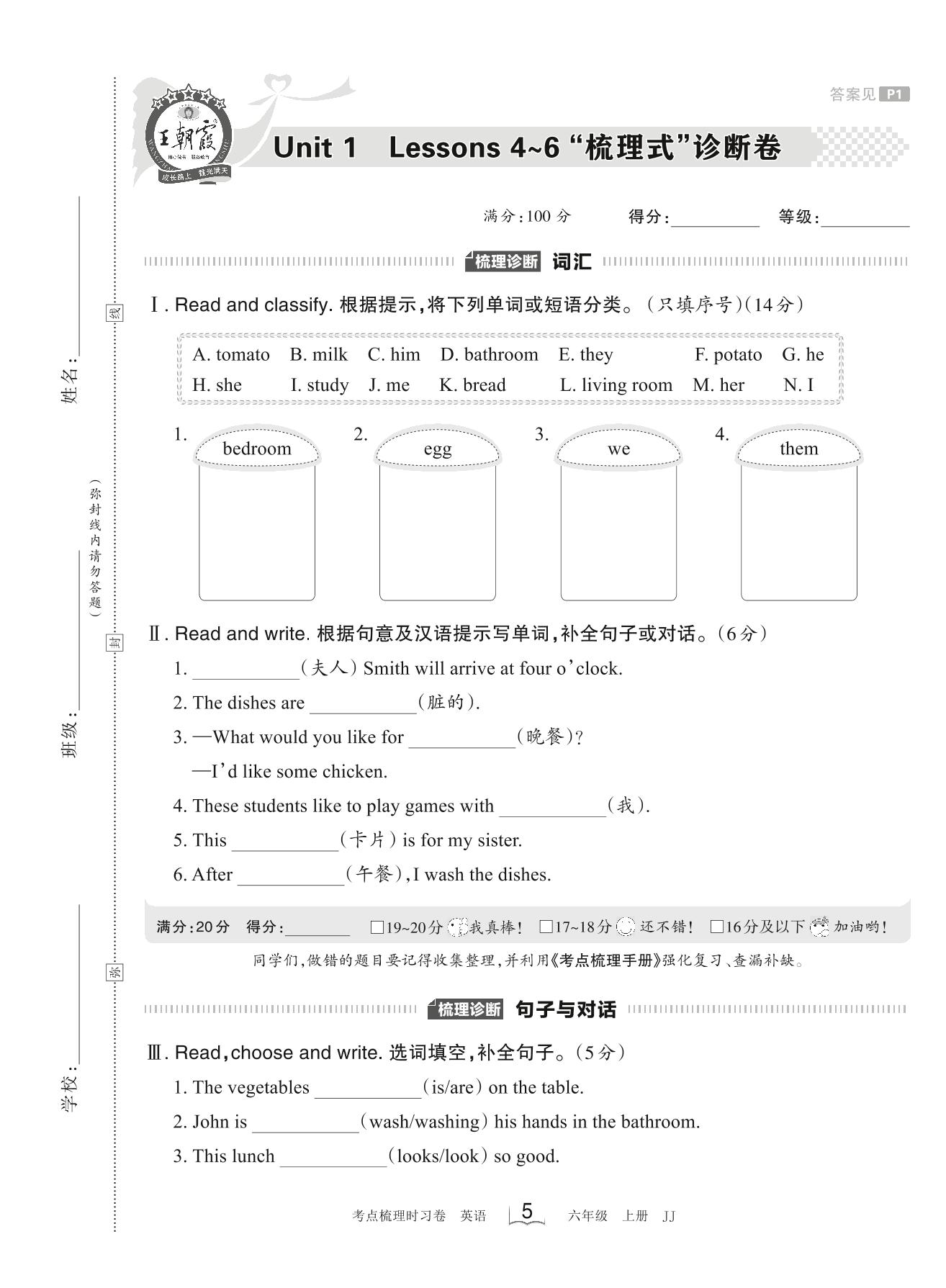 2023上册六年级英语冀教版 Unit 1 Lessons 4~6 “梳理式”诊断卷