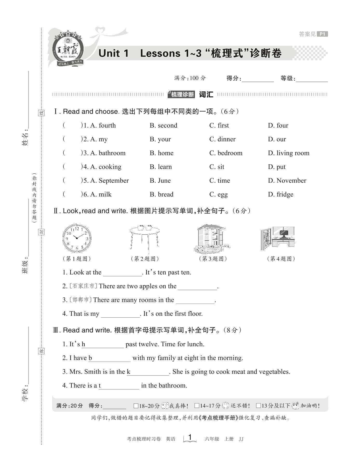 2023上册六年级英语冀教版 Unit 1 Lessons 1~3 “梳理式”诊断卷