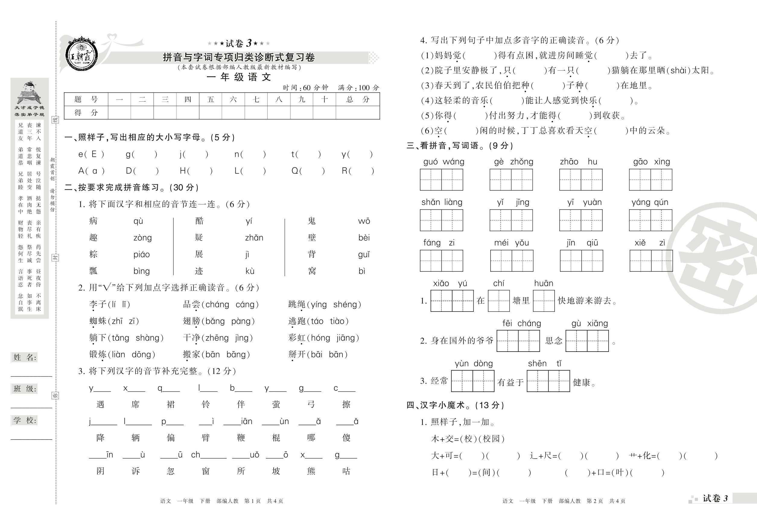王朝霞期末专项卷——拼音与字词专项归类诊断式复习卷一年级下册语文(人教版)_R210731191318【3】