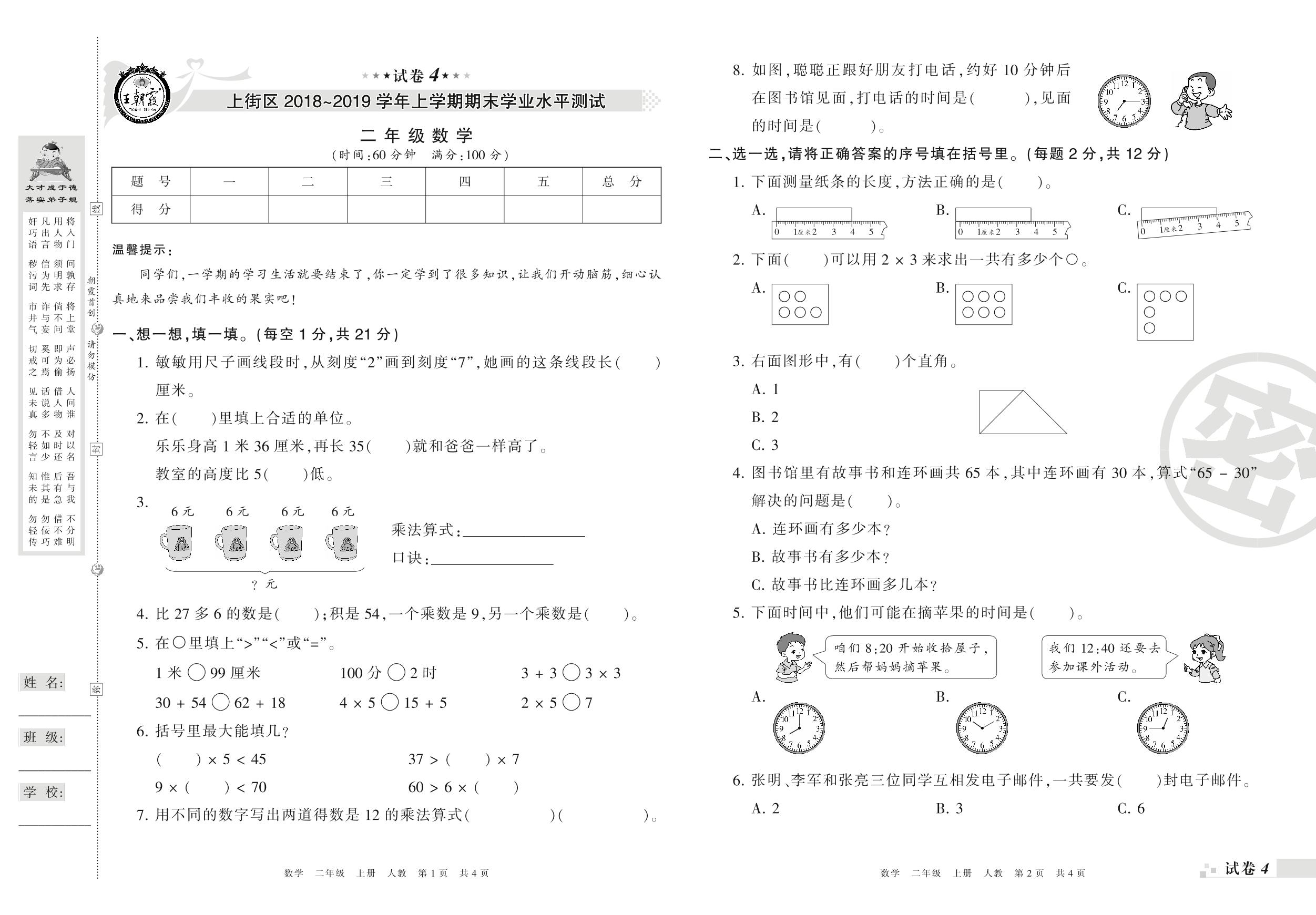 2018-2019学年第一学期郑州市上街区二年级数学试卷(人教版)【4】
