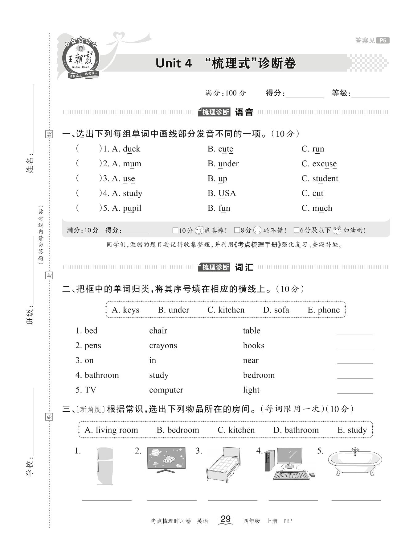 2023上册四年级英语人教PEP版 Unit 4 “梳理式”诊断卷