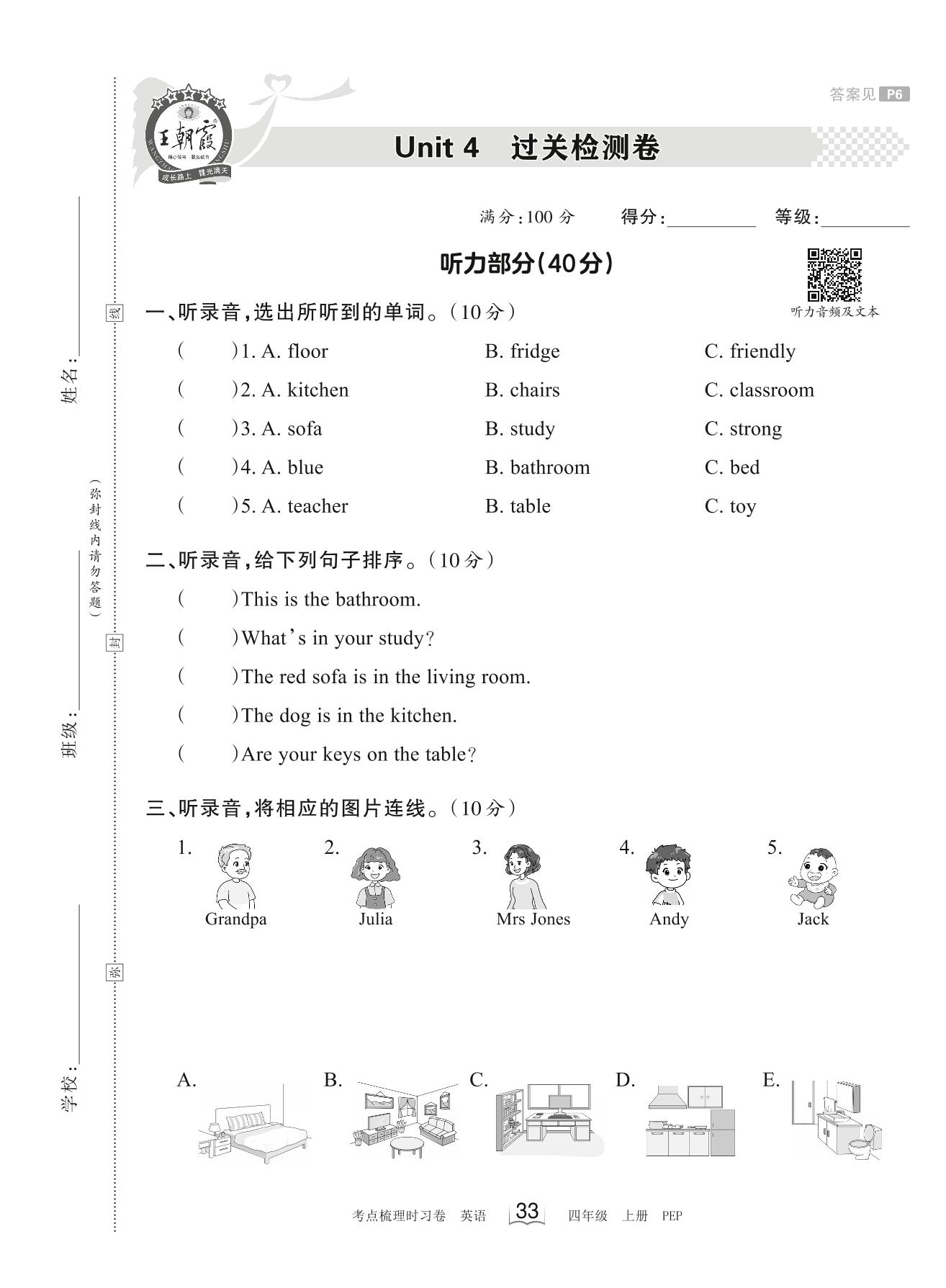 2023上册四年级英语人教PEP版 Unit 4 过关检测卷