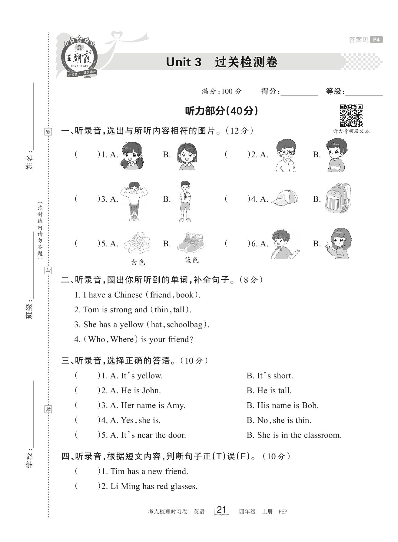 2023上册四年级英语人教PEP版 Unit 3 过关检测卷