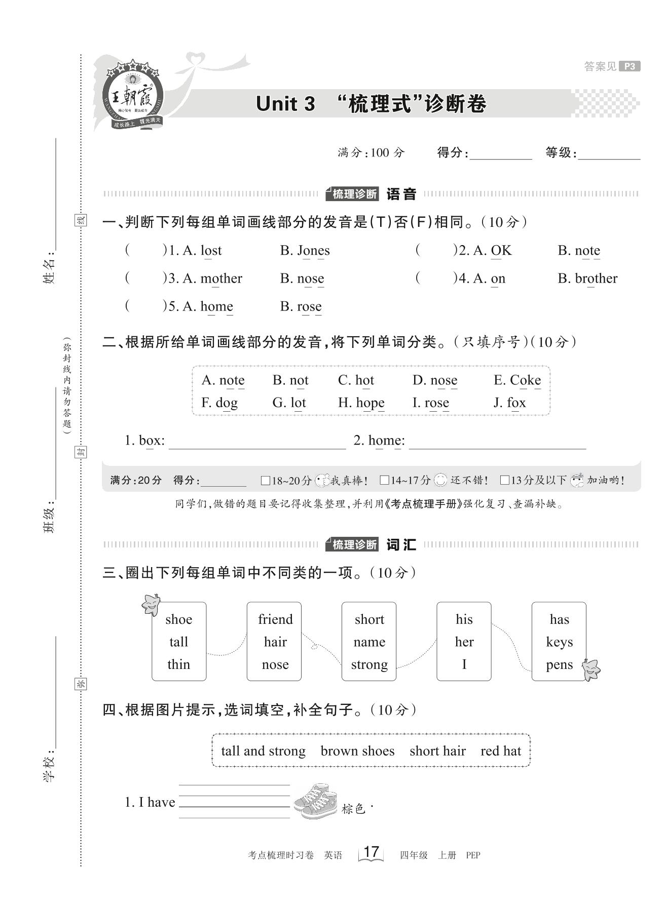 2023上册四年级英语人教PEP版 Unit 3 “梳理式”诊断卷