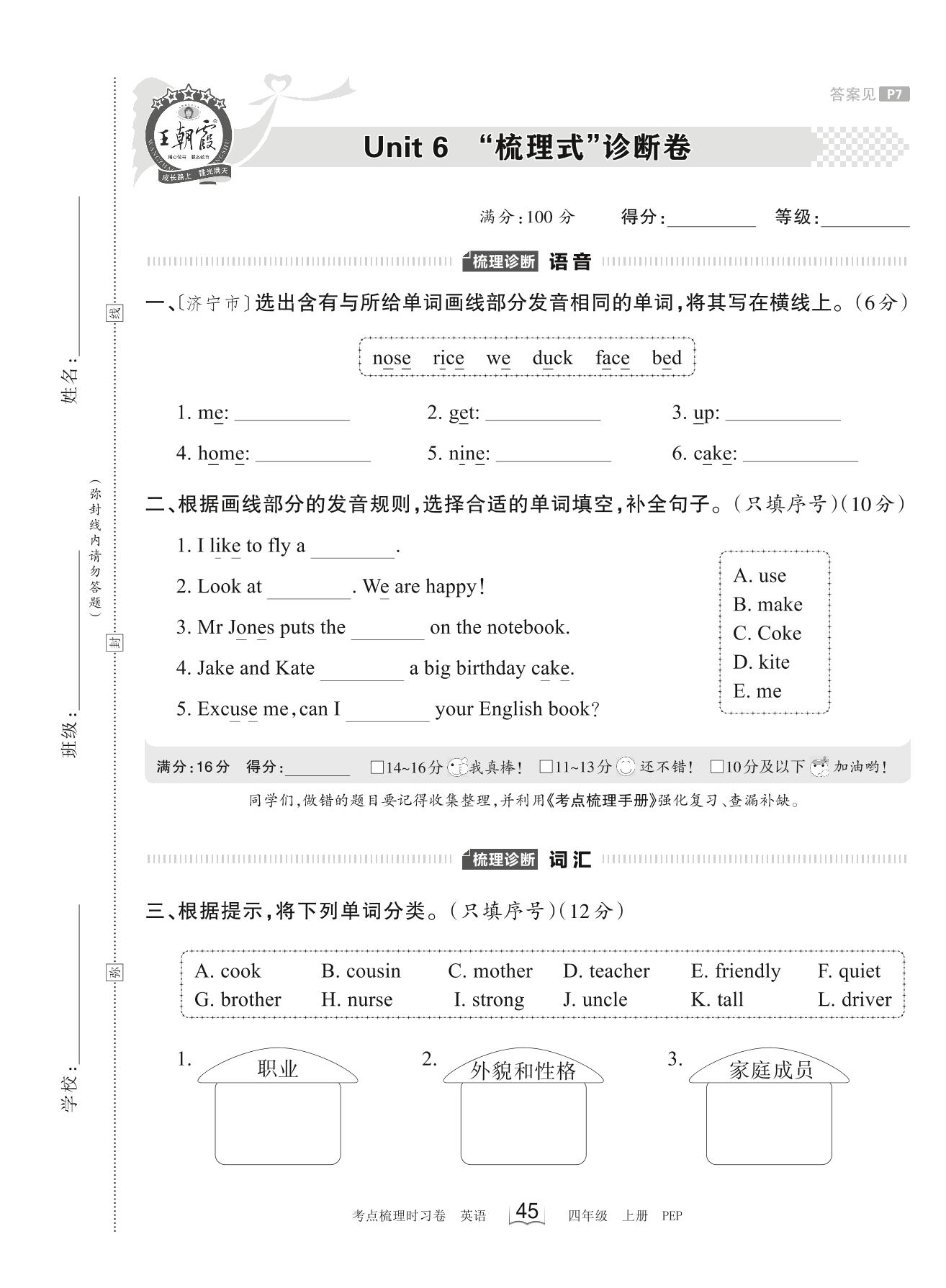 2023上册四年级英语人教PEP版 Unit 6 “梳理式”诊断卷