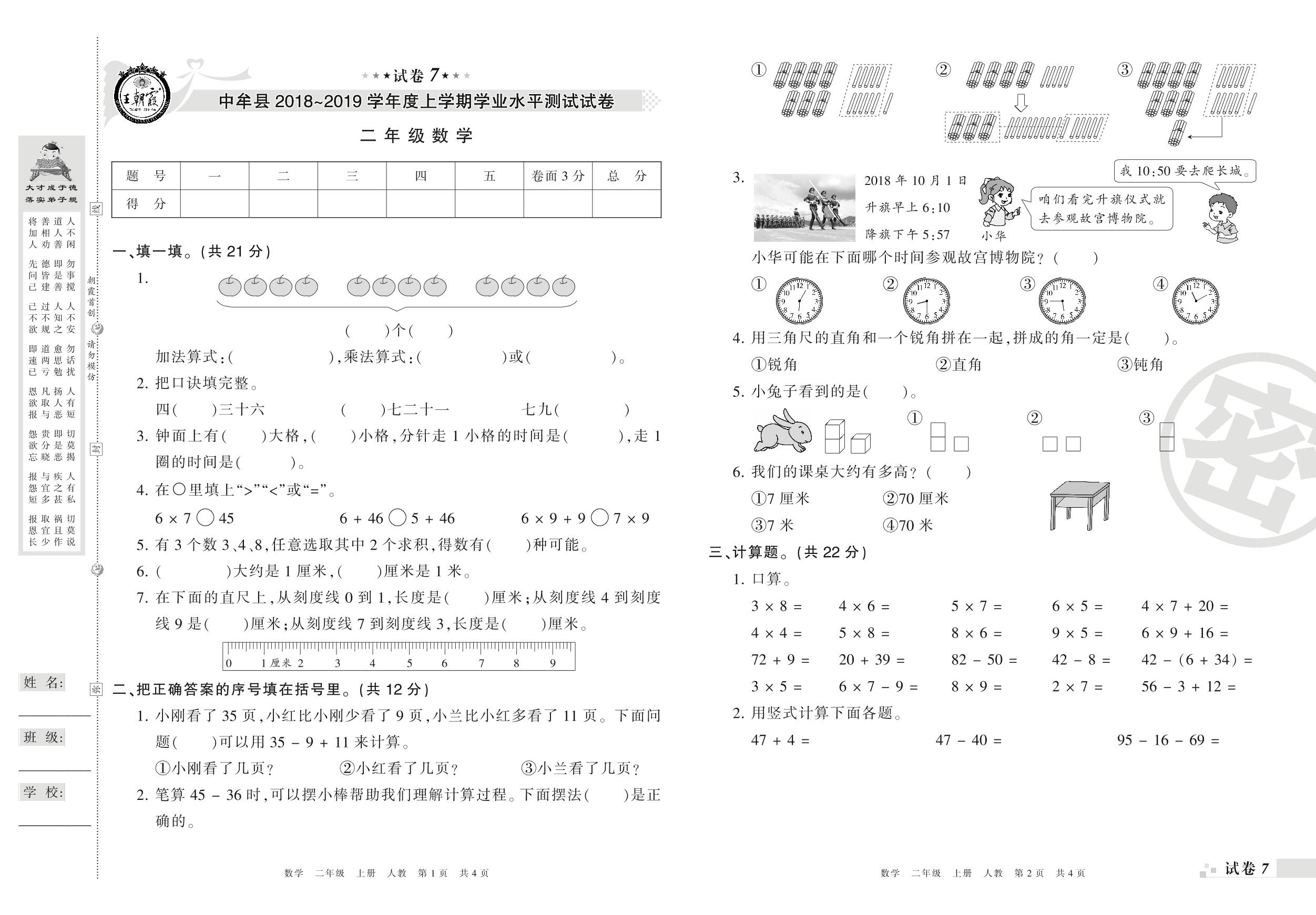 2018-2019学年第一学期郑州市中牟县二年级数学试卷(人教版)【7】