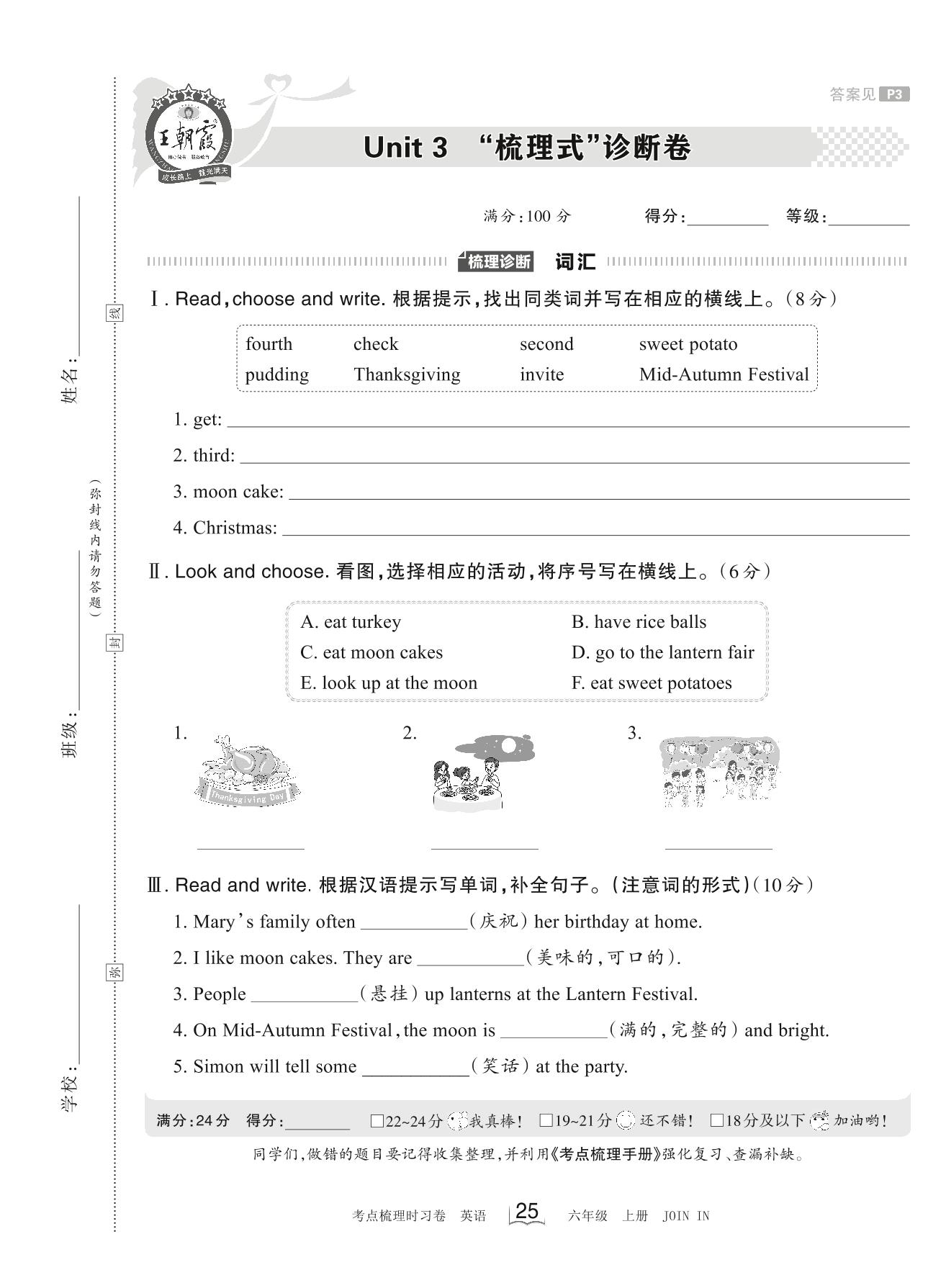 2023上册六年级英语剑桥版 Unit 3 “梳理式”诊断卷