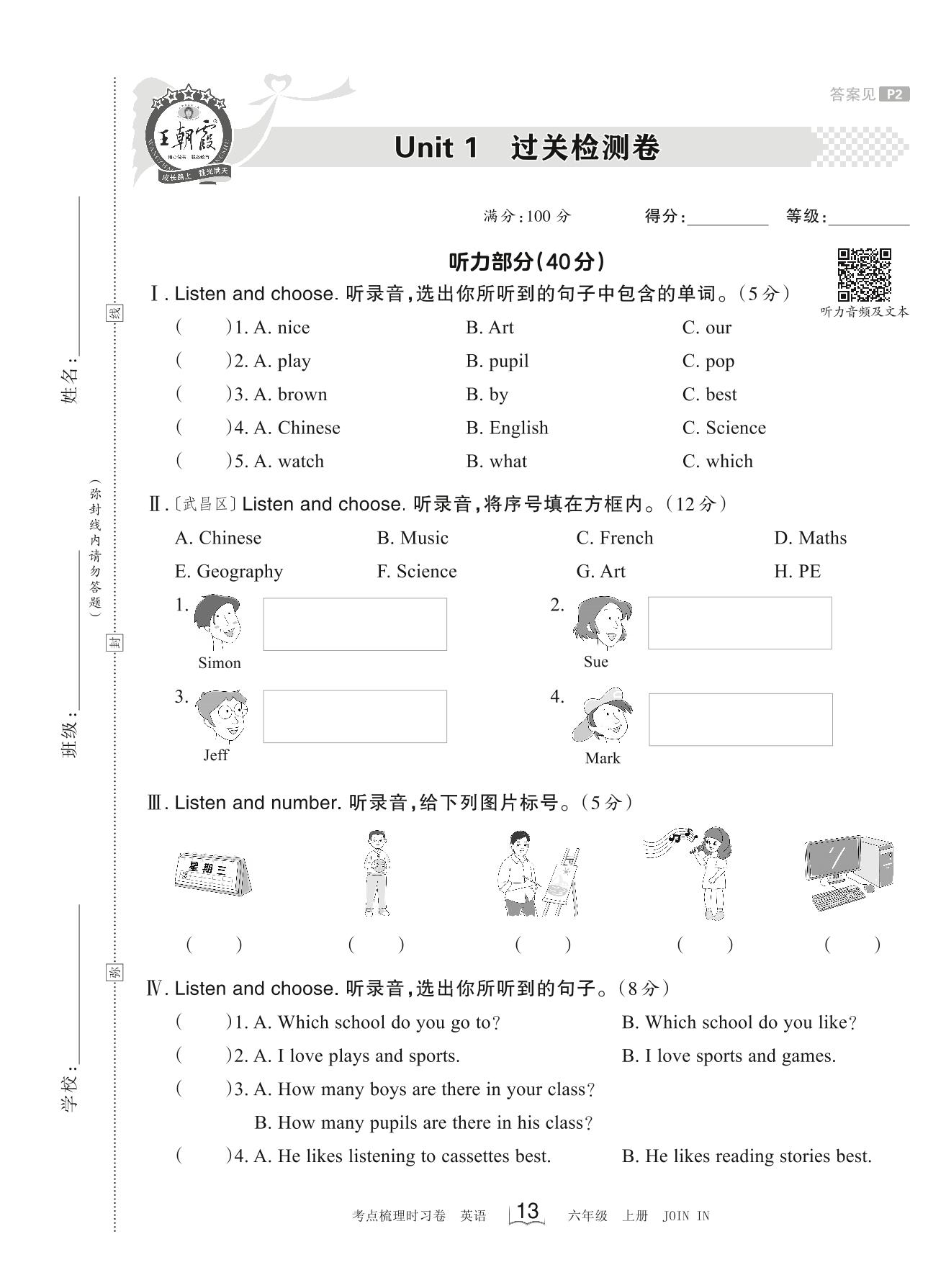 2023上册六年级英语剑桥版 Unit 1 过关检测卷