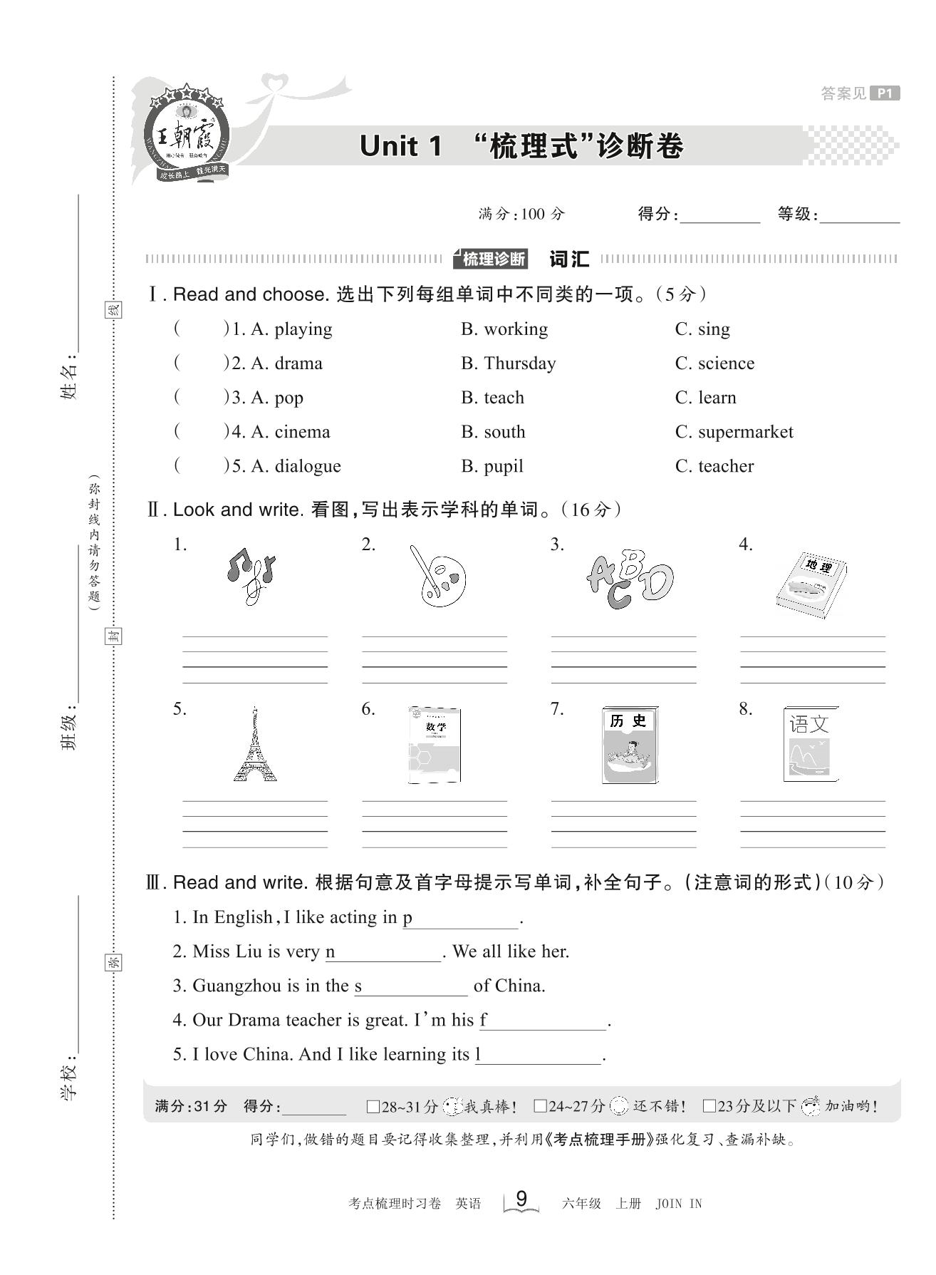 2023上册六年级英语剑桥版 Unit 1 “梳理式”诊断卷