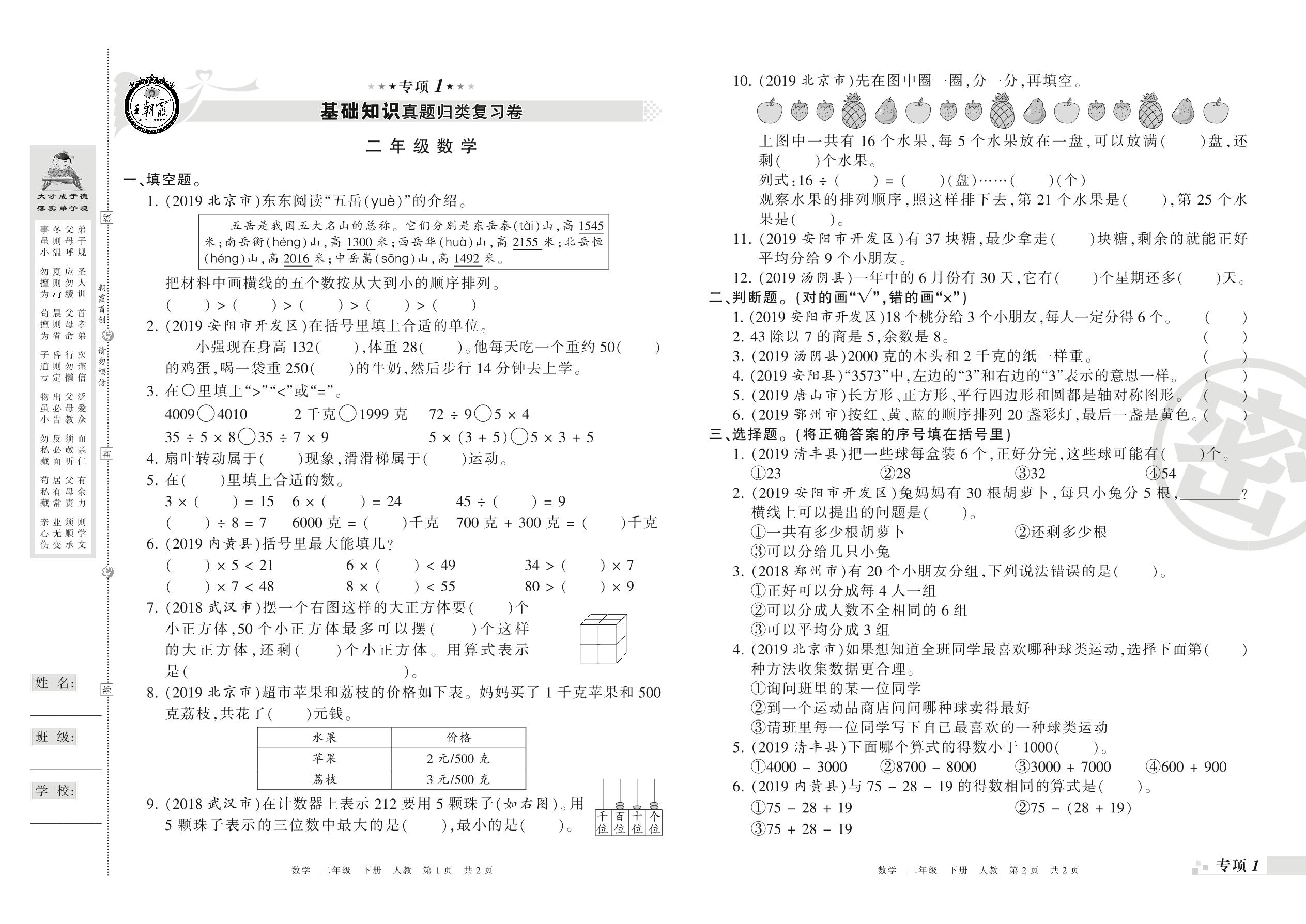 王朝霞期末专项卷——基础知识、计算真题归类复习卷二年级下册数学(人教版)_R21080390518【0】