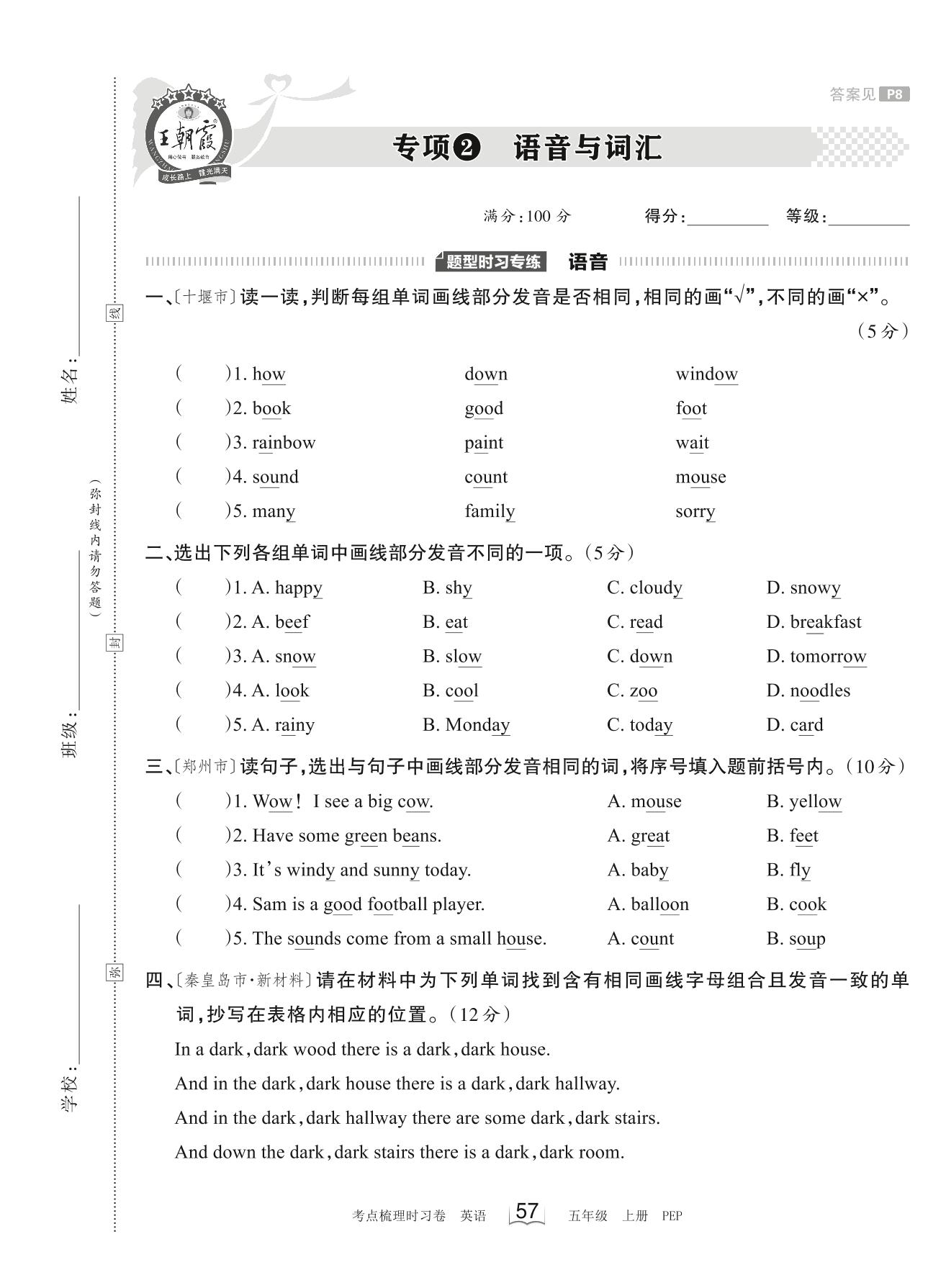 2023上册五年级英语人教PEP版 专项2 语音与词汇