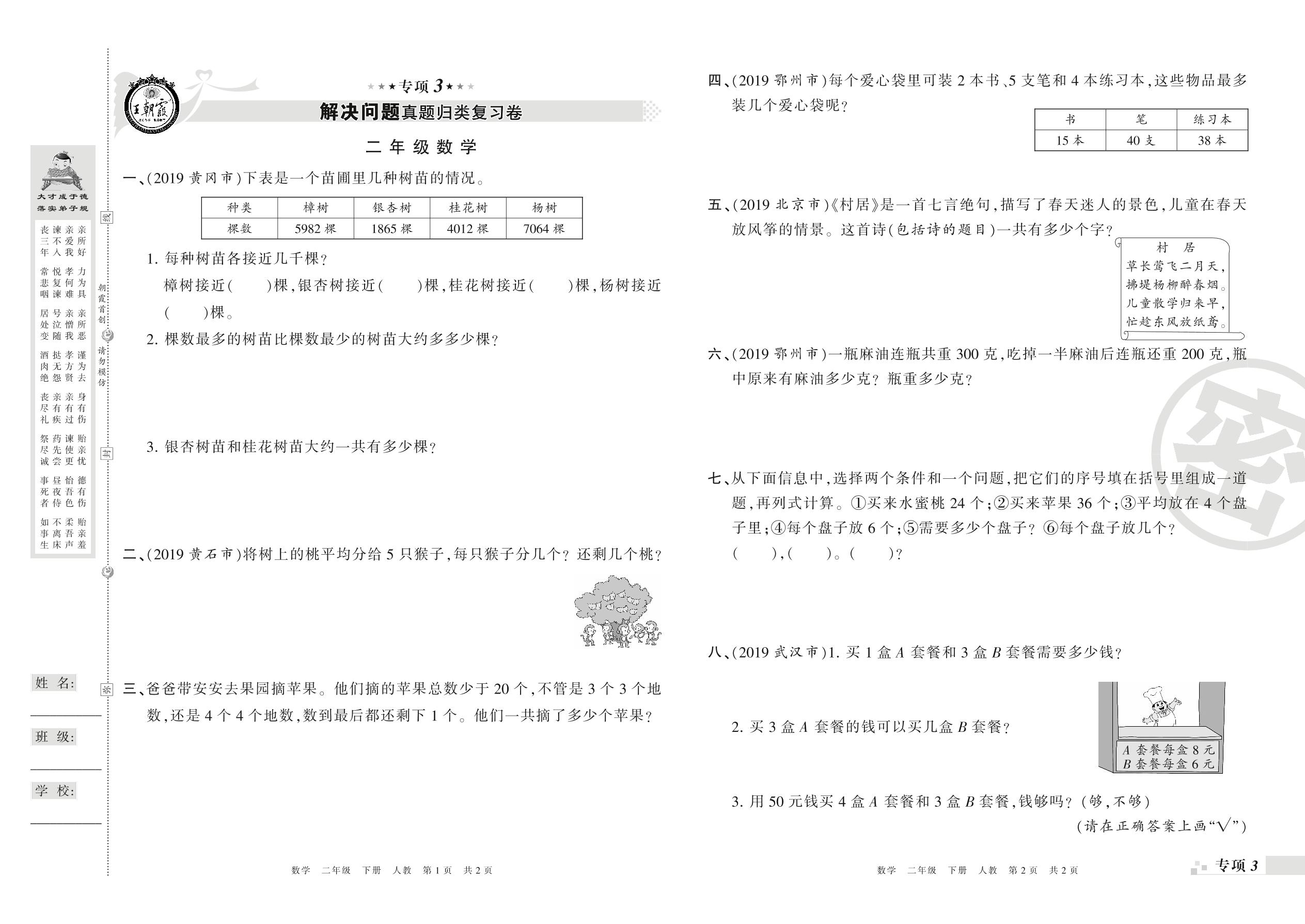 王朝霞期末专项卷——解决问题真题归类复习卷、新颖题速递:生活与数学二年级下册数学(人教版)_R21080390521【0】