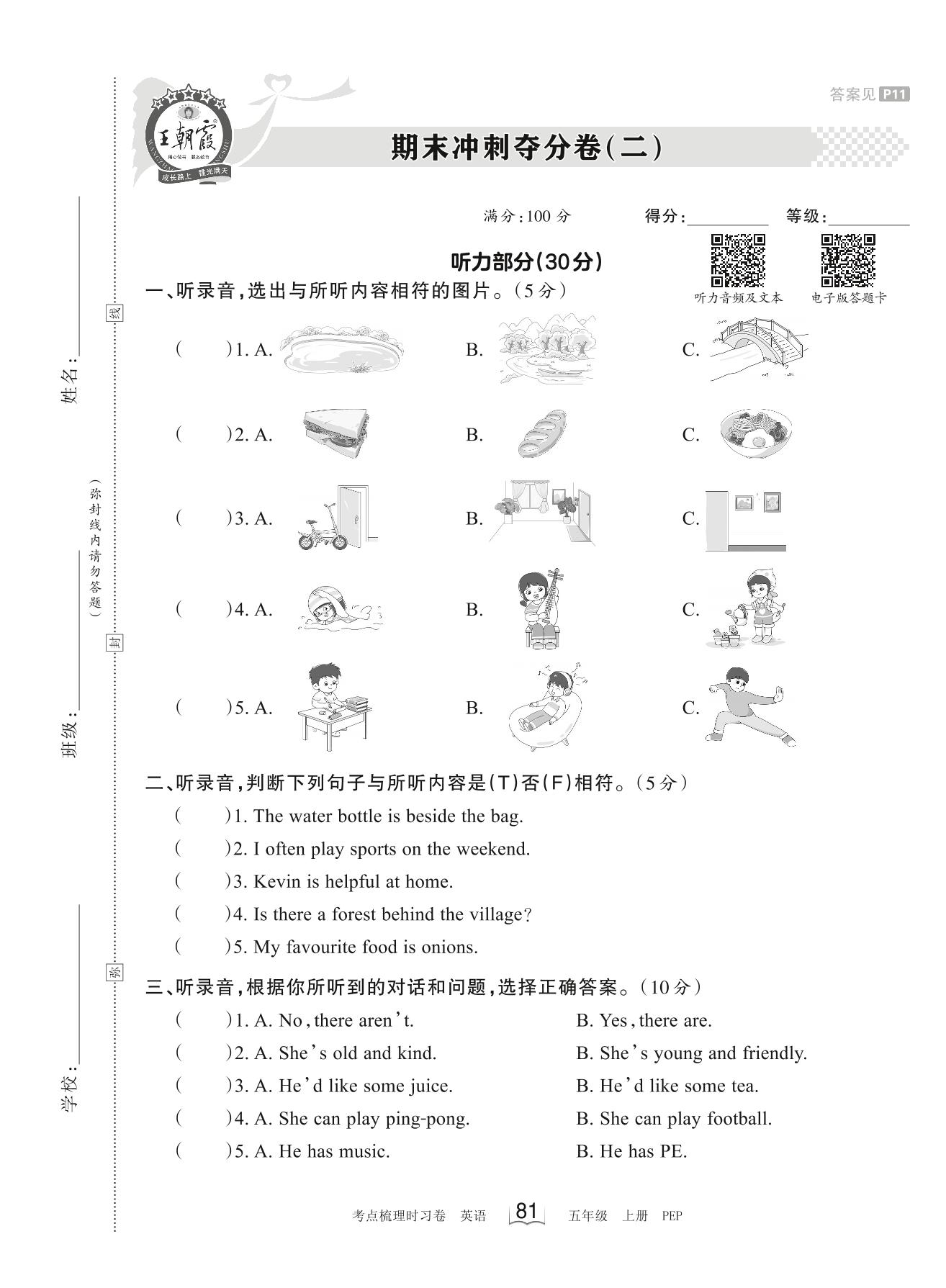 五年级英语人教PEP版(三起始)上册期末卷