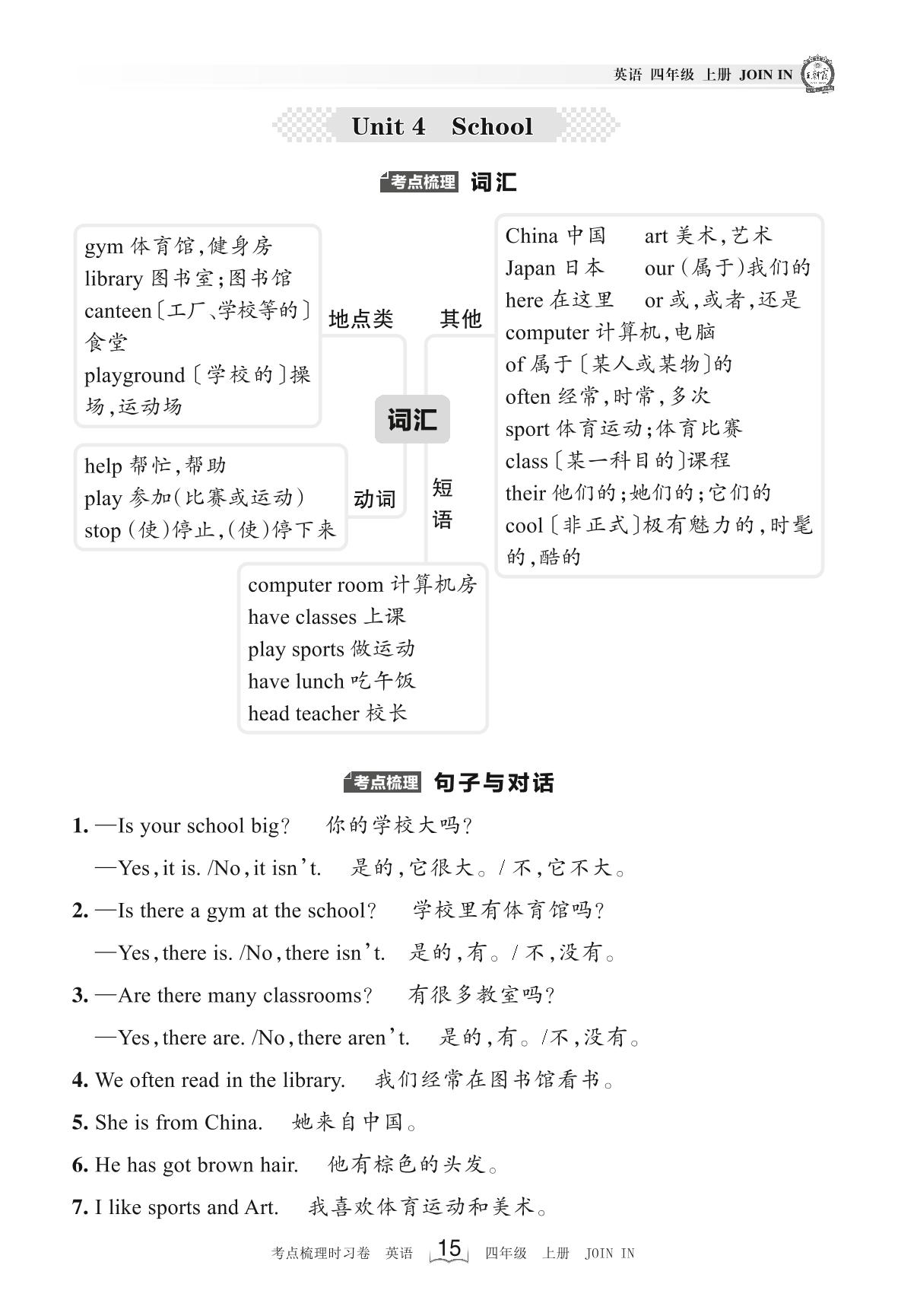2023上册四年级英语剑桥版 考点梳理手册——Unit 4 School