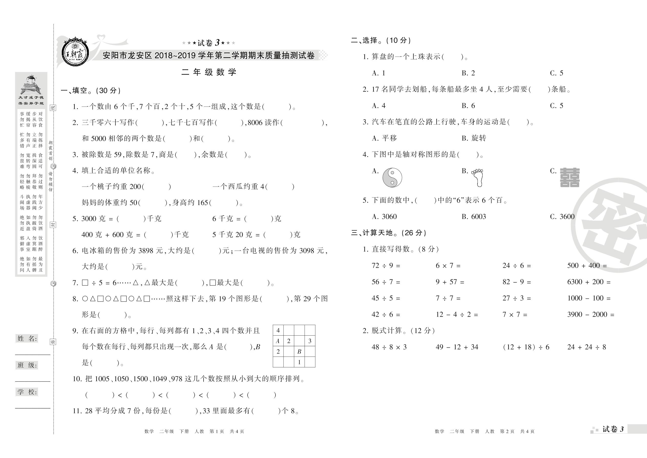 2018-2019学年第二学期安阳市龙安区二年级数学试卷(人教版)【3】