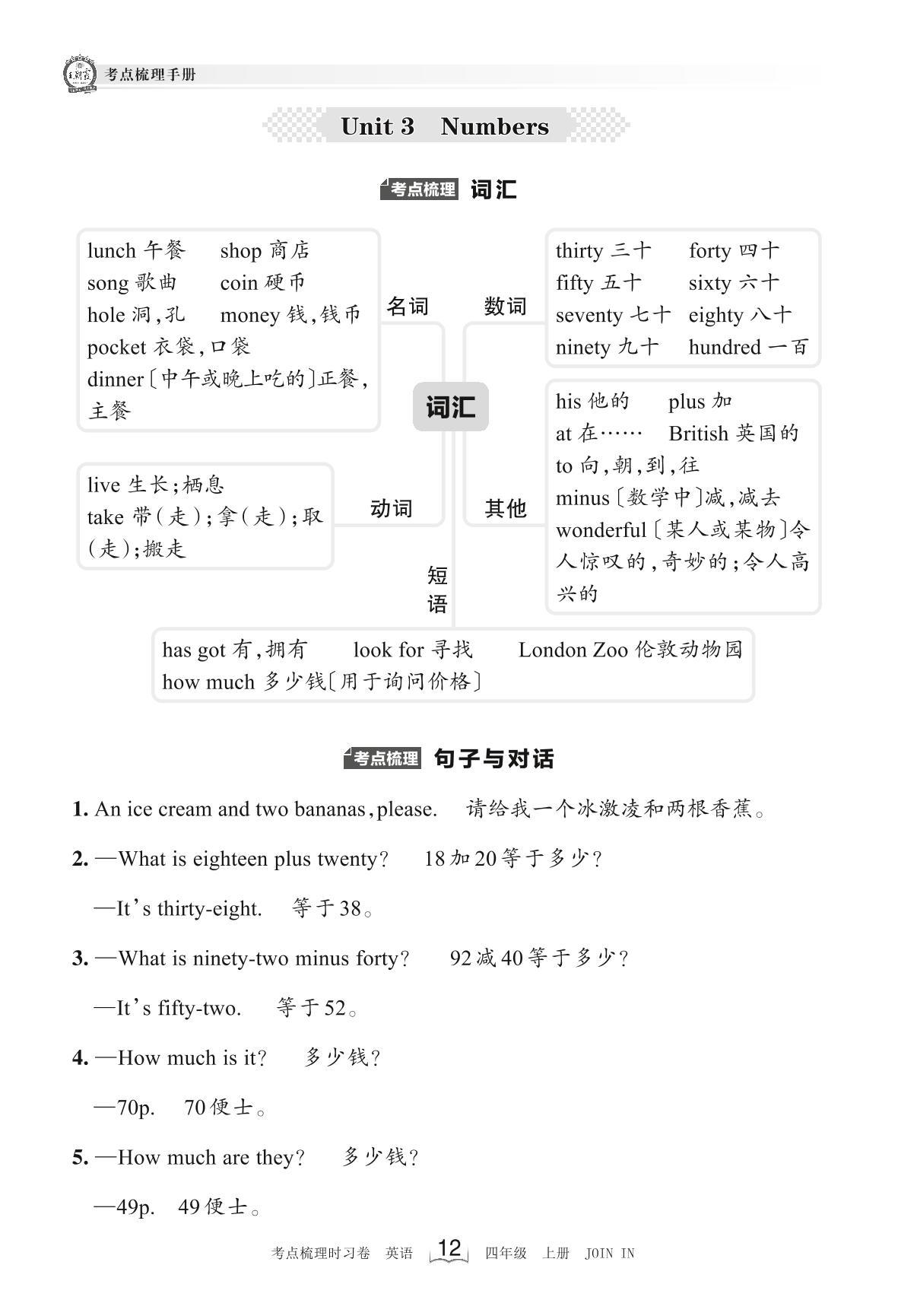 2023上册四年级英语剑桥版 考点梳理手册——Unit 3 Numbers