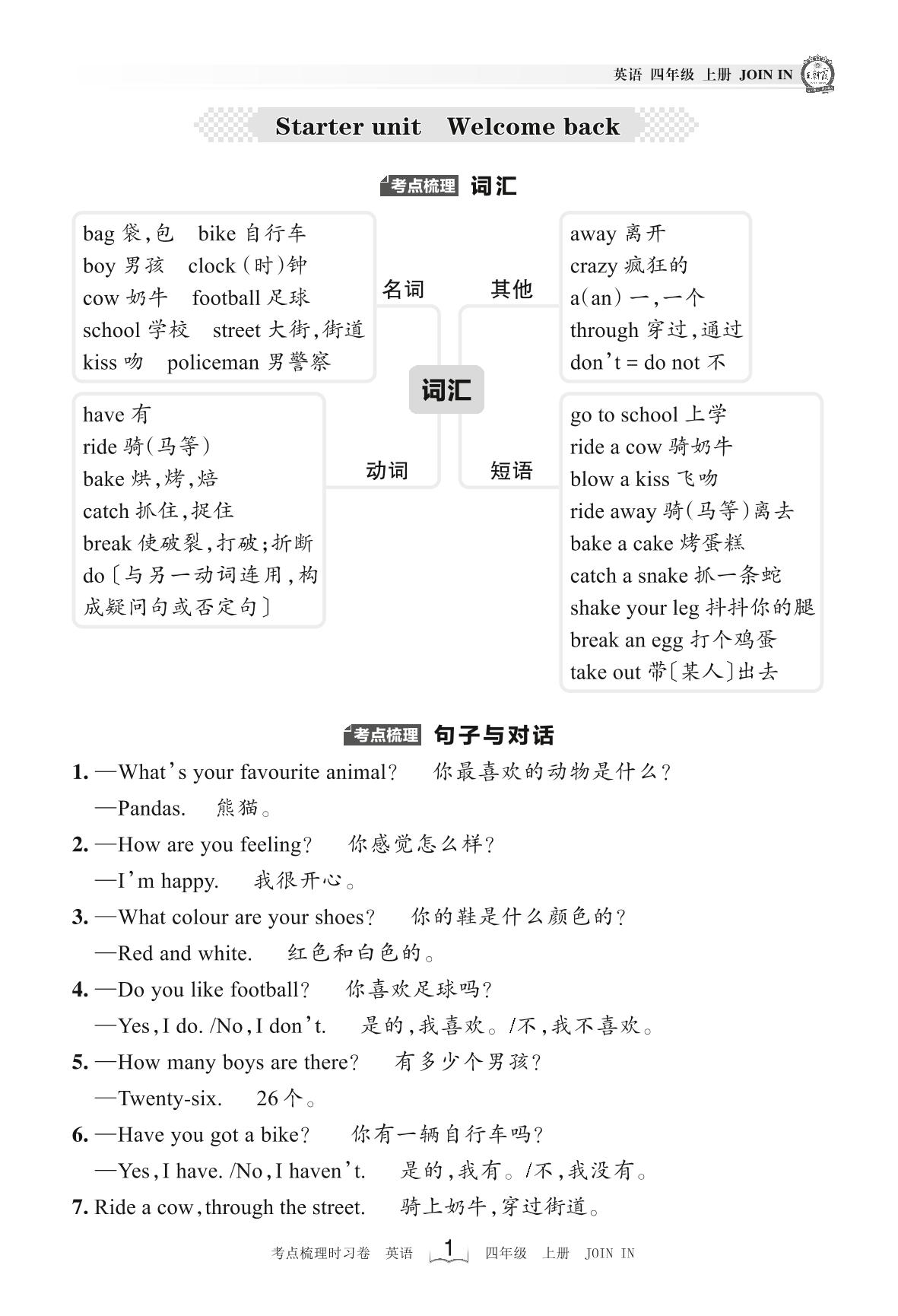 2023上册四年级英语剑桥版 考点梳理手册——Starter unit Welcome back
