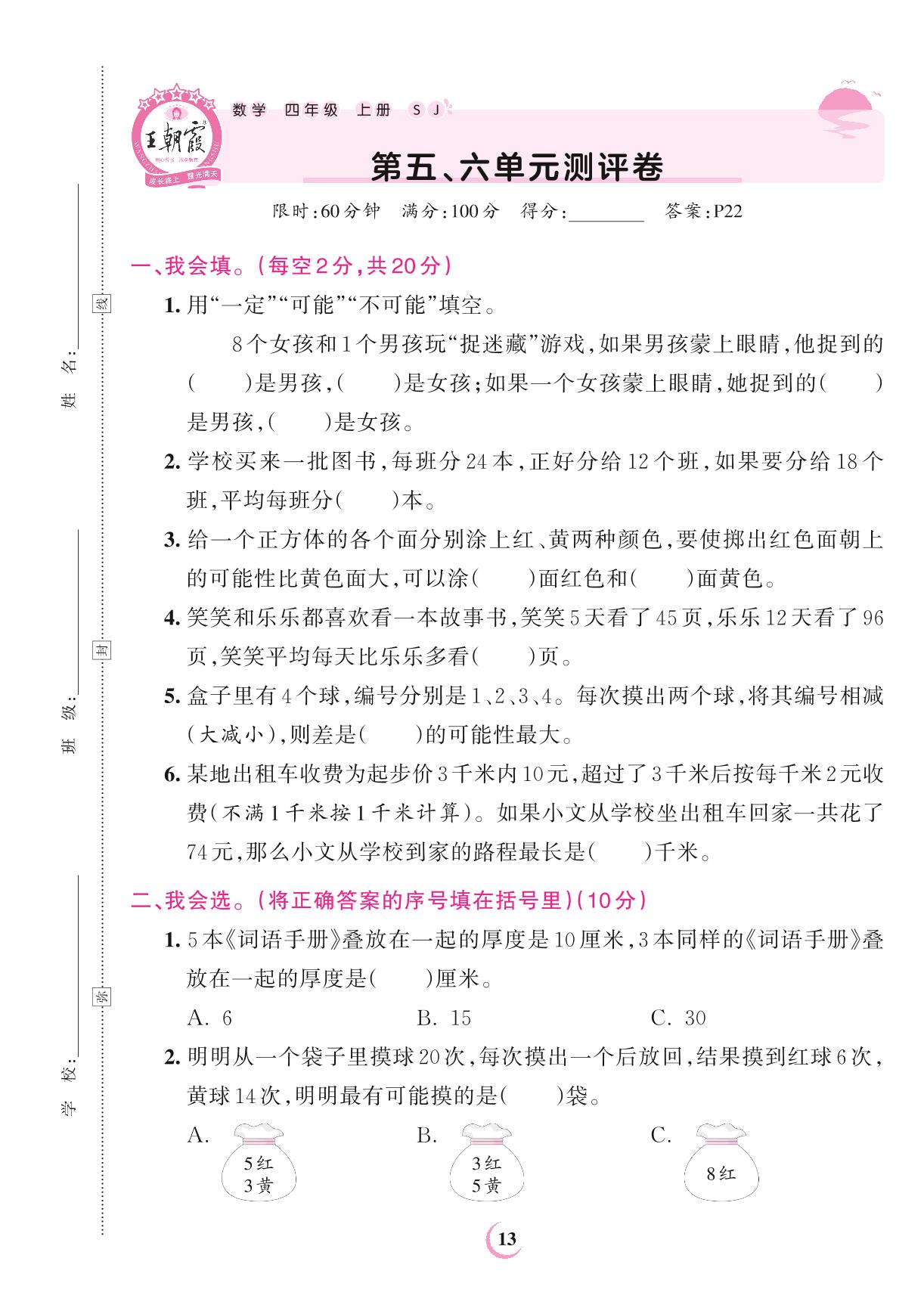 2023上册四年级数学苏教版 第五、六单元测评卷