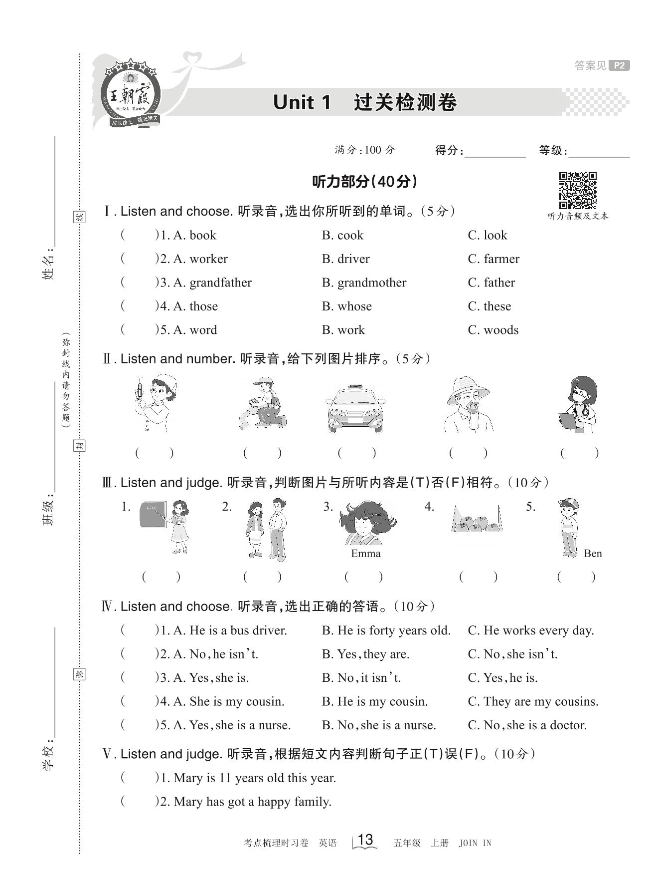 五年级英语剑桥版上册单元卷