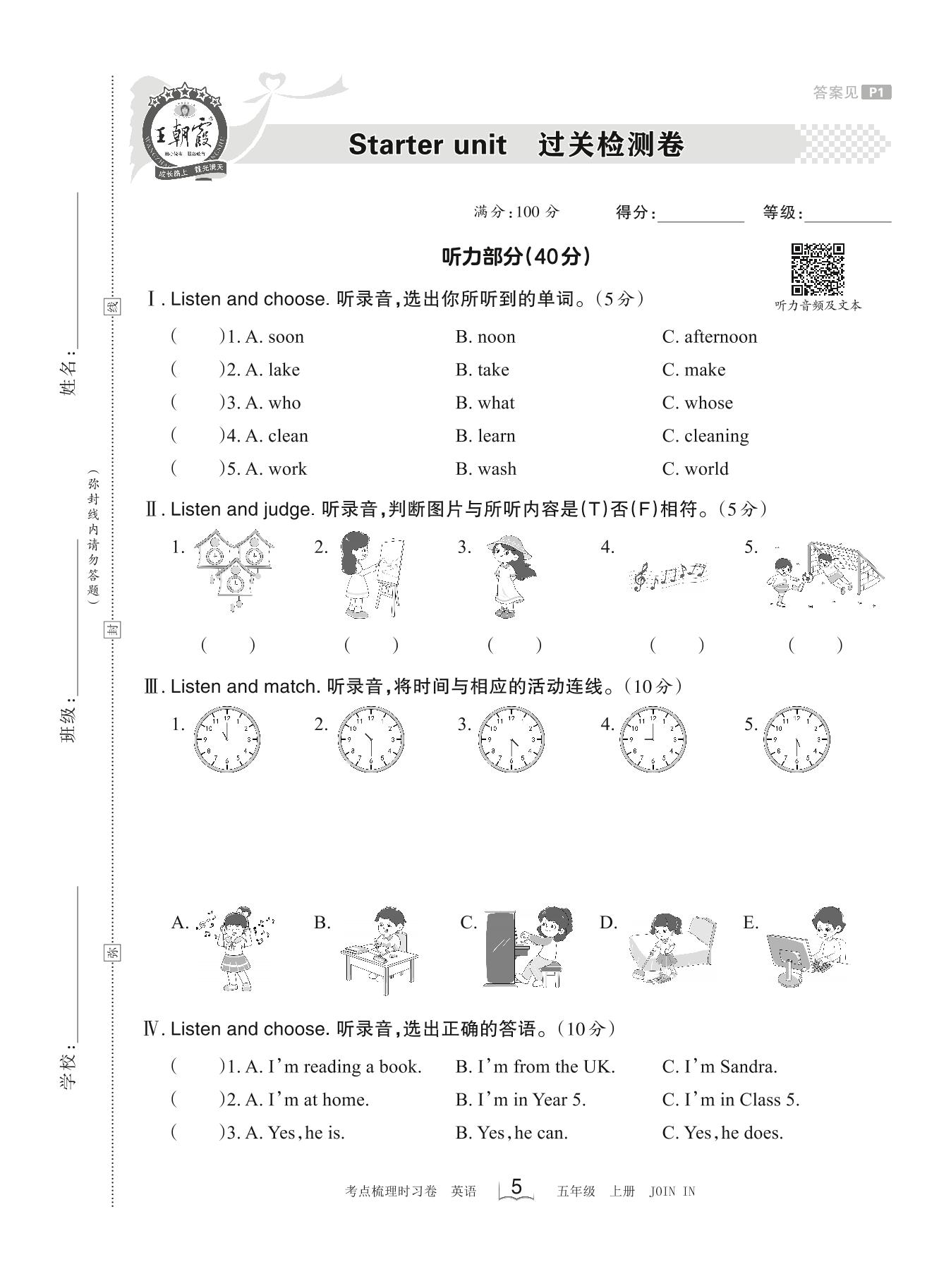 2023上册五年级英语剑桥版 Starter unit 过关检测卷