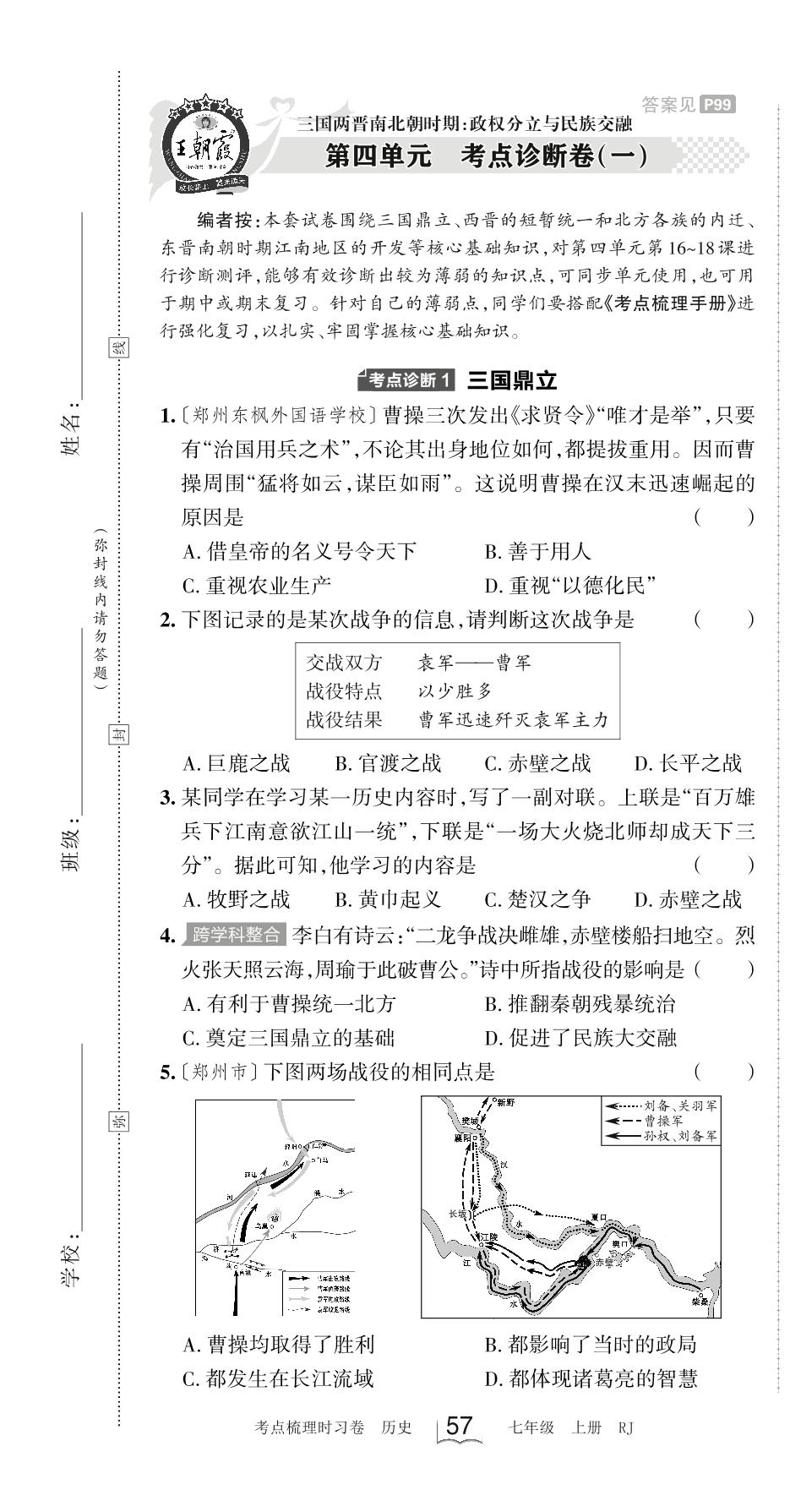 2023上册七年级历史人教版 第四单元 考点诊断卷(一)