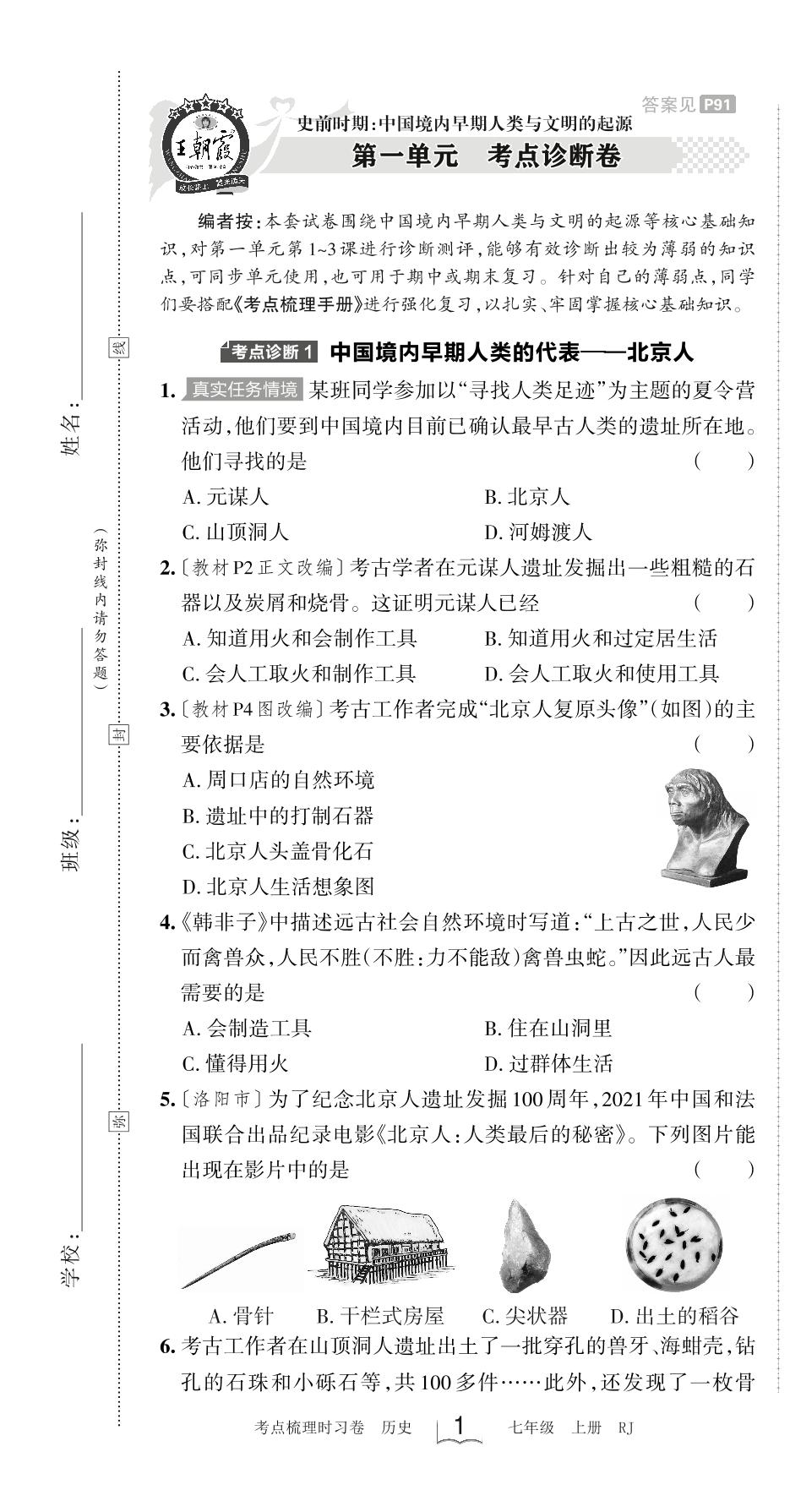 2023上册七年级历史人教版 第一单元 考点诊断卷