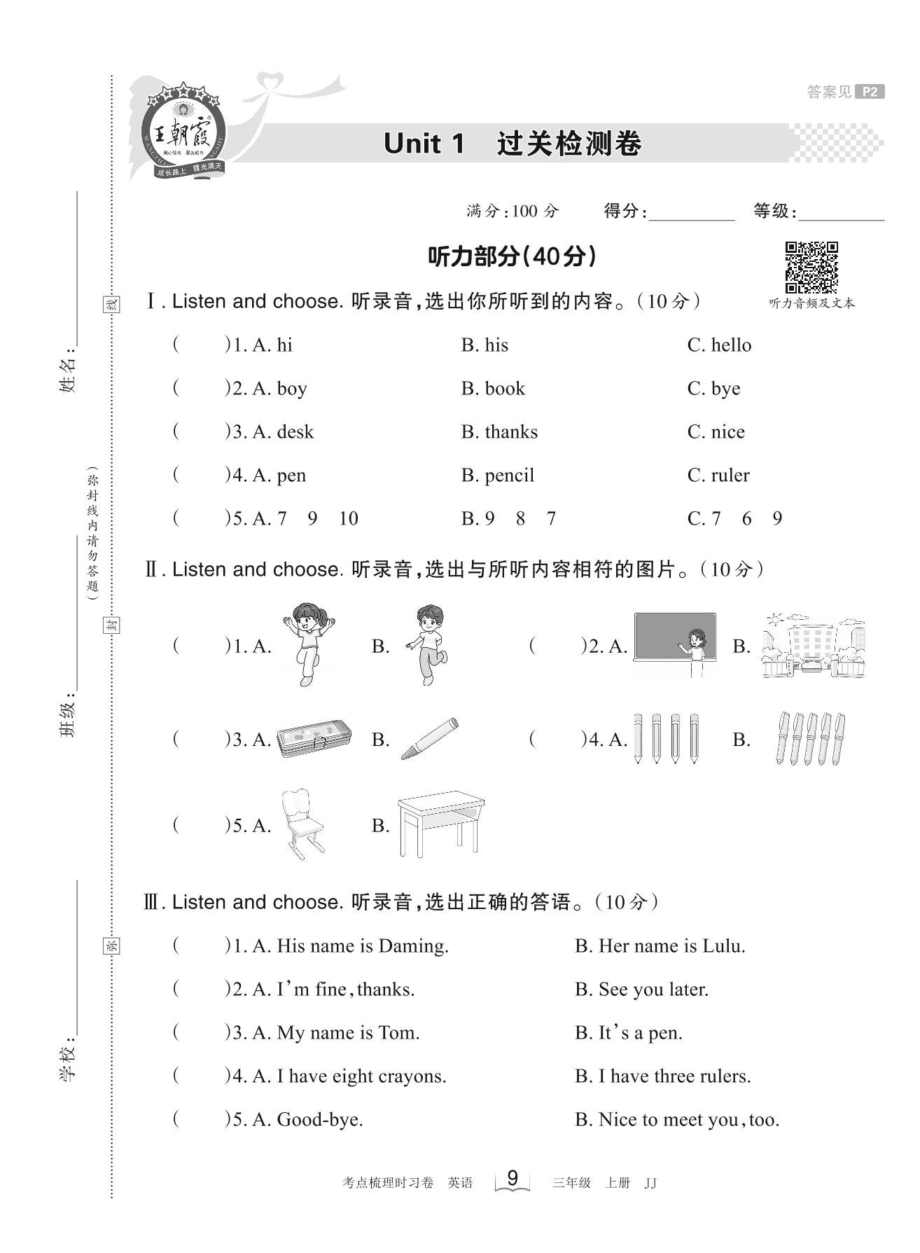2023上册三年级英语冀教版 Unit 1 过关检测卷