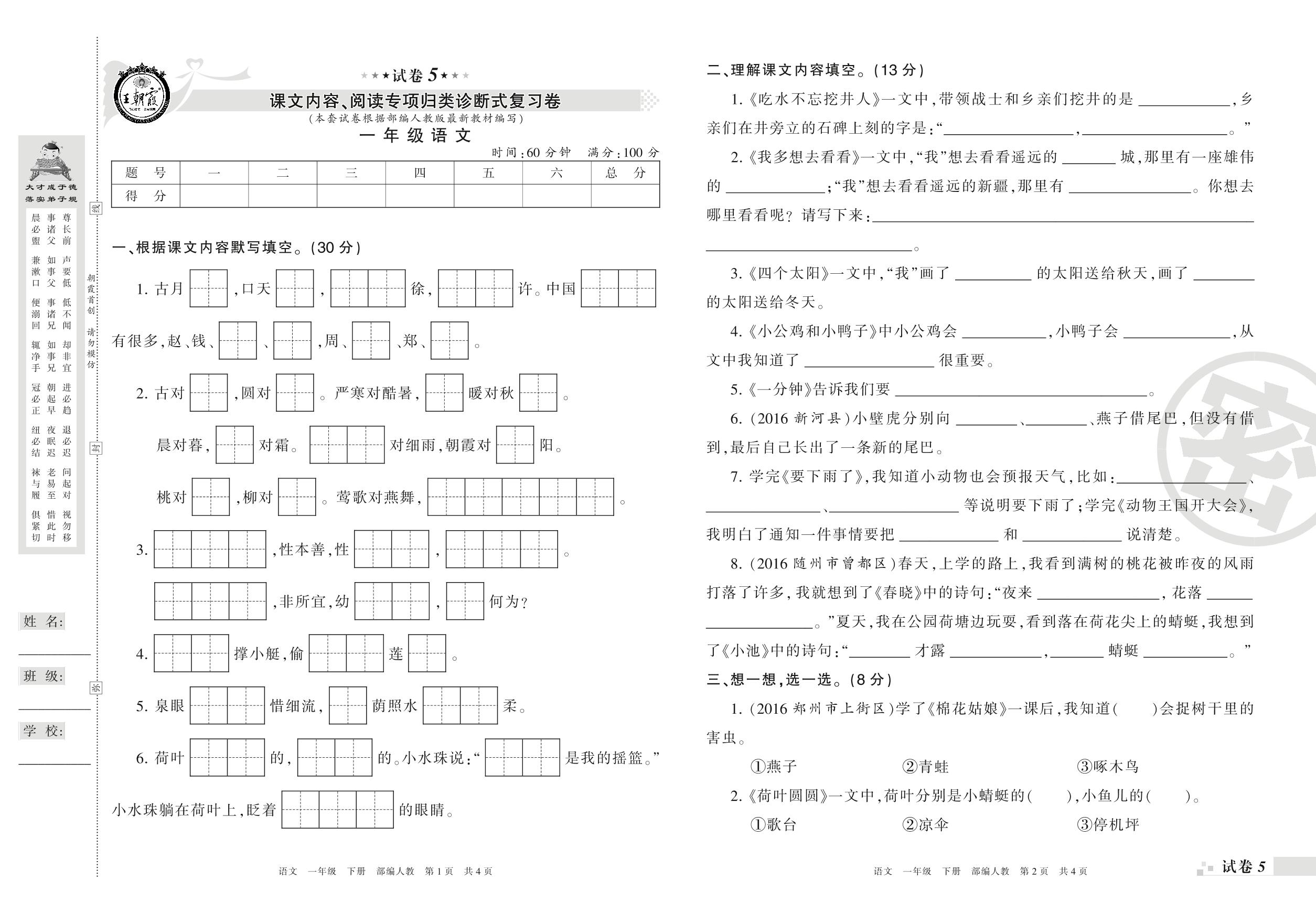 王朝霞期末专项卷——课文内容、阅读专项归类诊断式复习卷一年级下册语文(人教版)_R210731191322【5】