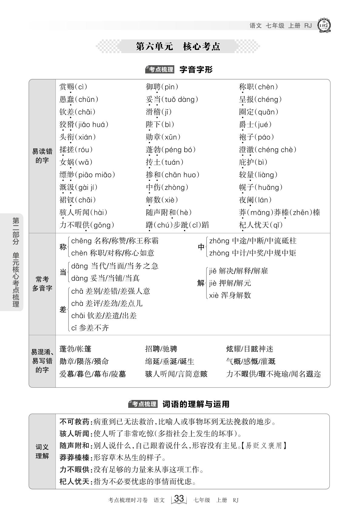 2023上册七年级语文人教版 考点梳理手册——第六单元 核心考点