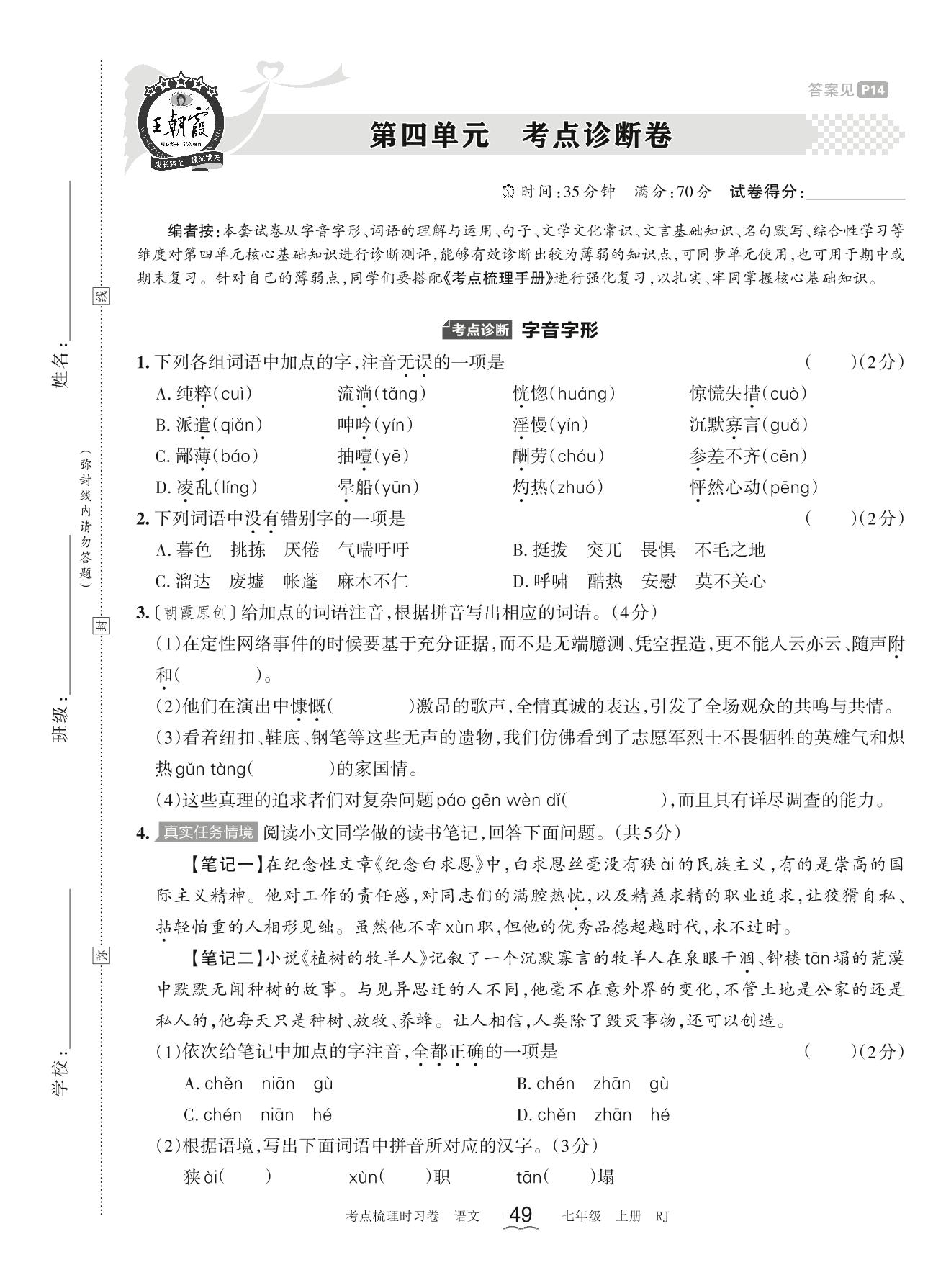 2023上册七年级语文人教版 第四单元 考点诊断卷