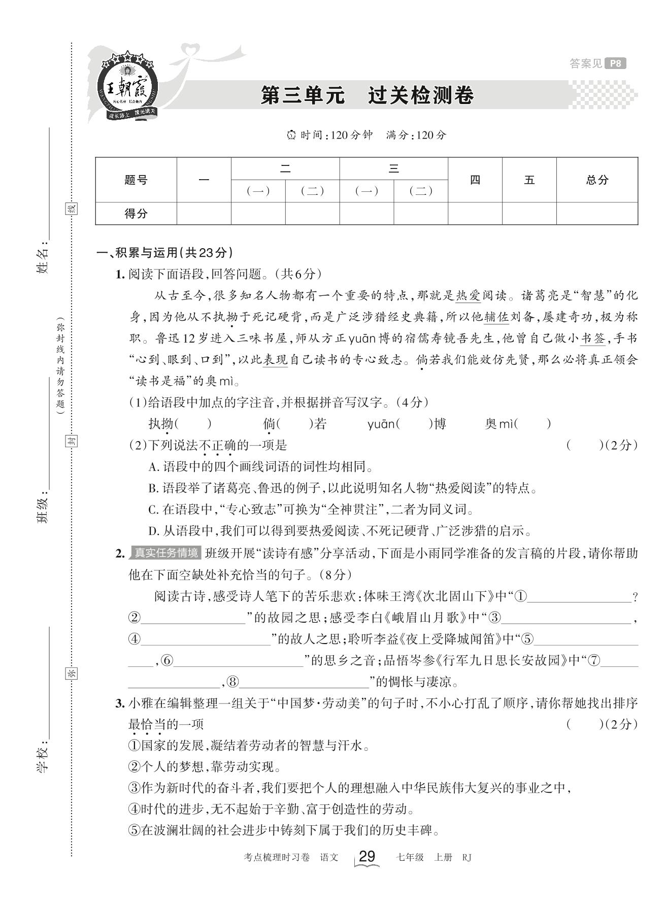 2023上册七年级语文人教版 第三单元 过关检测卷