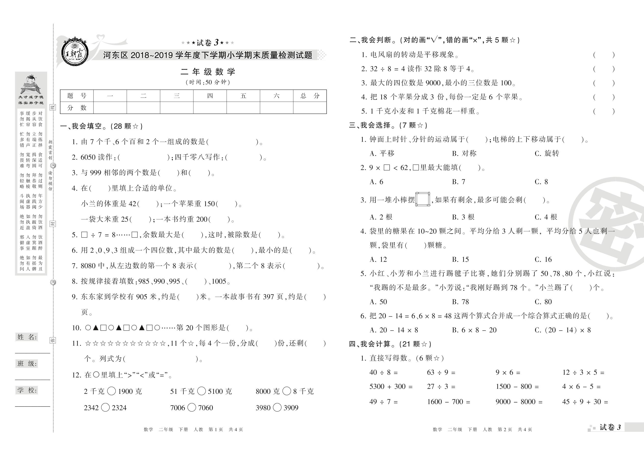 2018-2019学年第二学期临沂市河东区二年级数学试卷(人教版)【3】