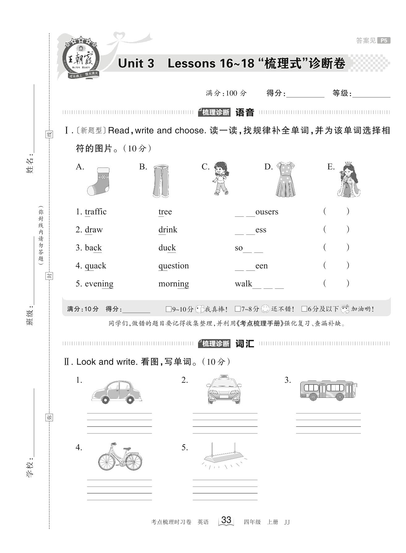 2023上册四年级英语冀教版 Unit 3 Lessons 16~18 “梳理式”诊断卷