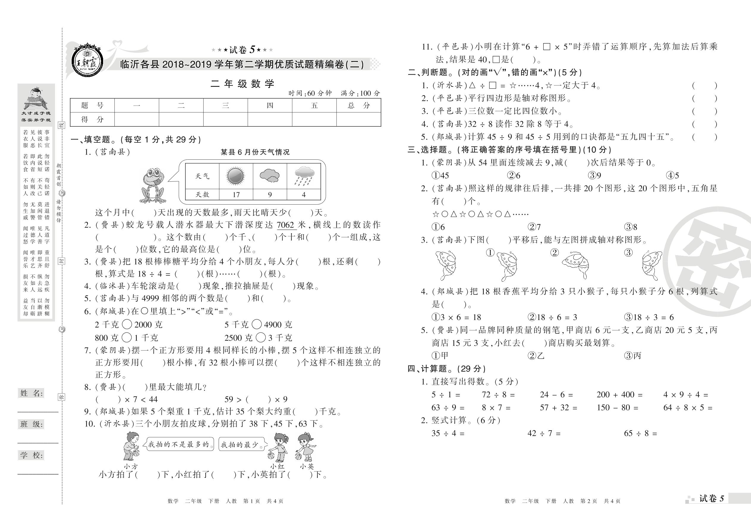临沂各县优质试题精编卷(二)二年级下册数学(人教版)【5】