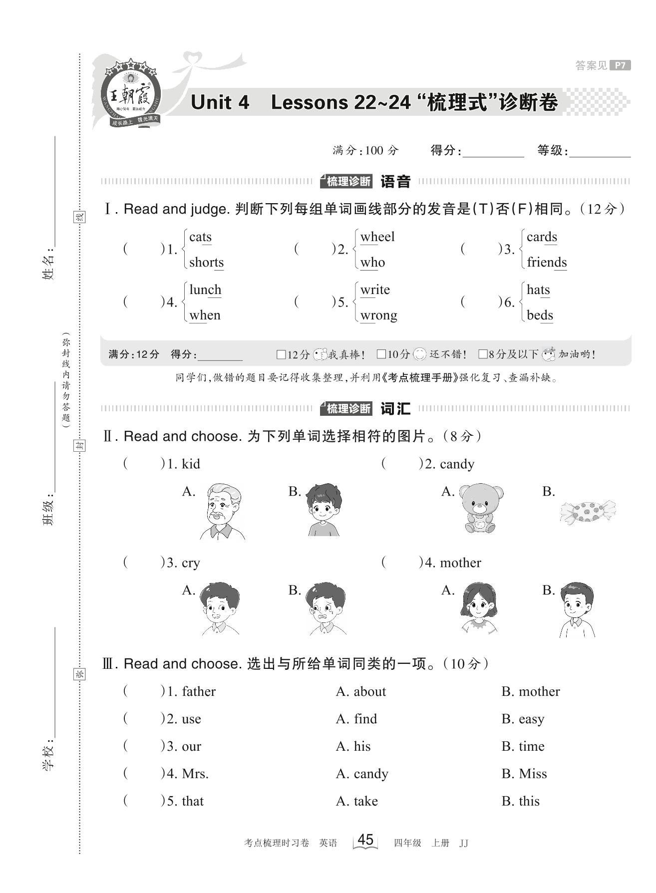 2023上册四年级英语冀教版 Unit 4 Lessons 22~24 “梳理式”诊断卷