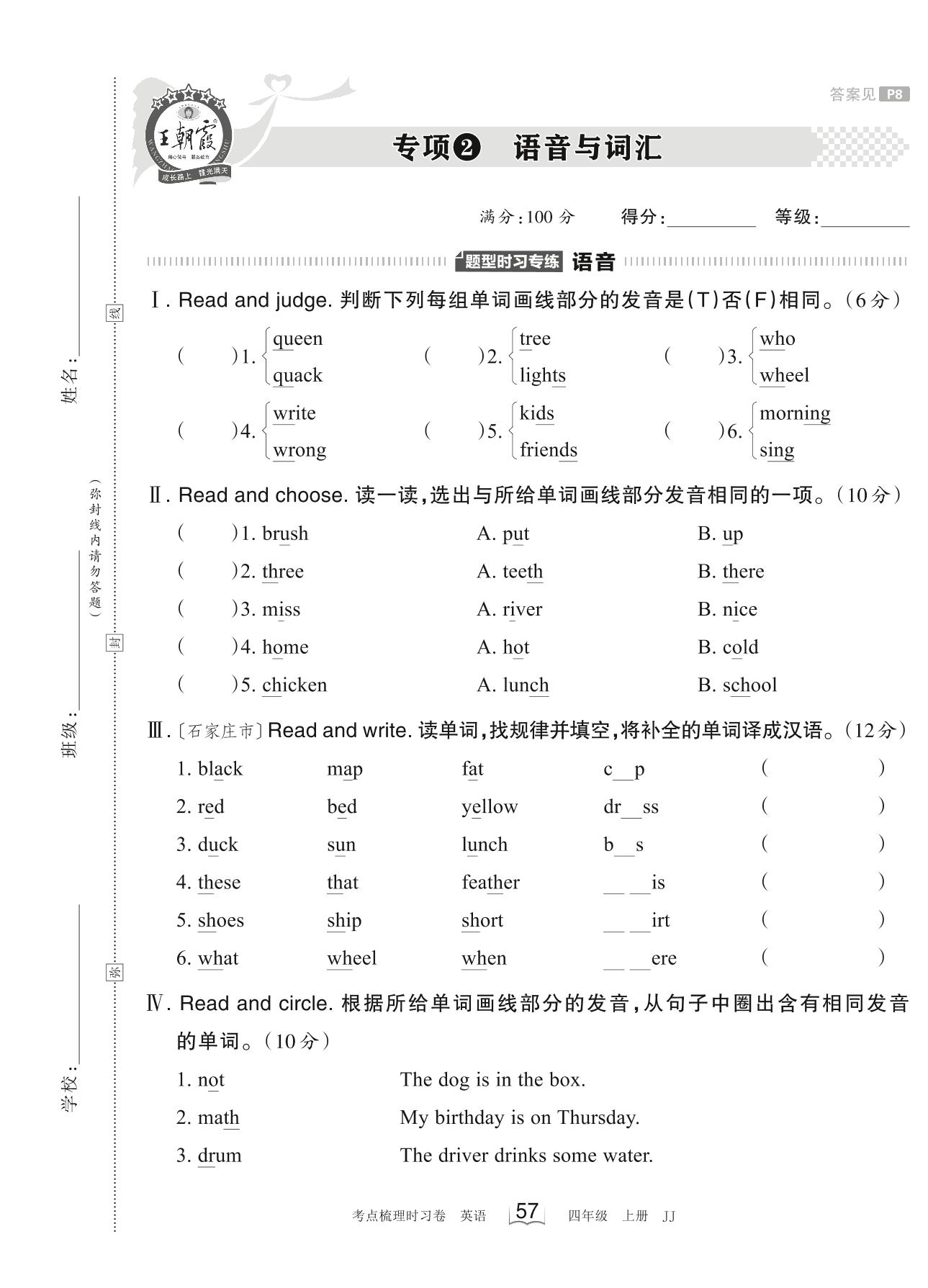 2023上册四年级英语冀教版 专项2 语音与词汇