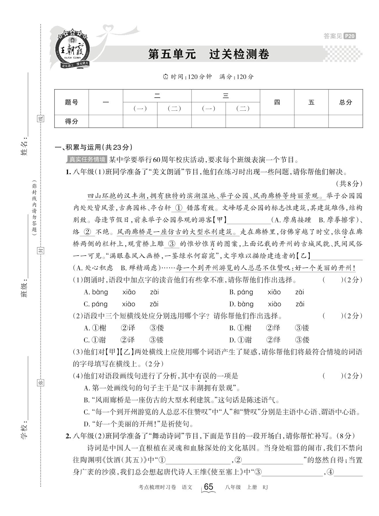 2023上册八年级语文人教版 第五单元 过关检测卷