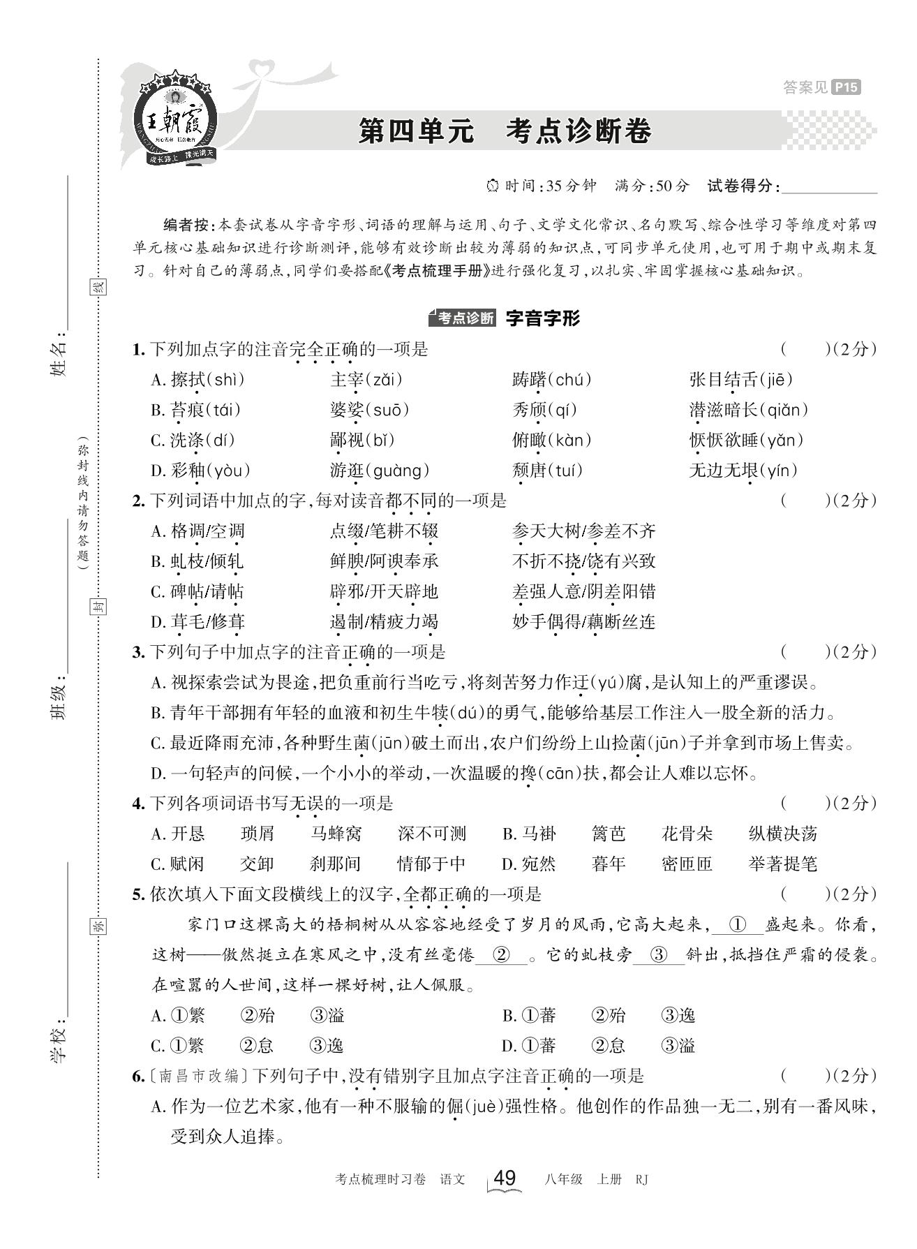 2023上册八年级语文人教版 第四单元 考点诊断卷