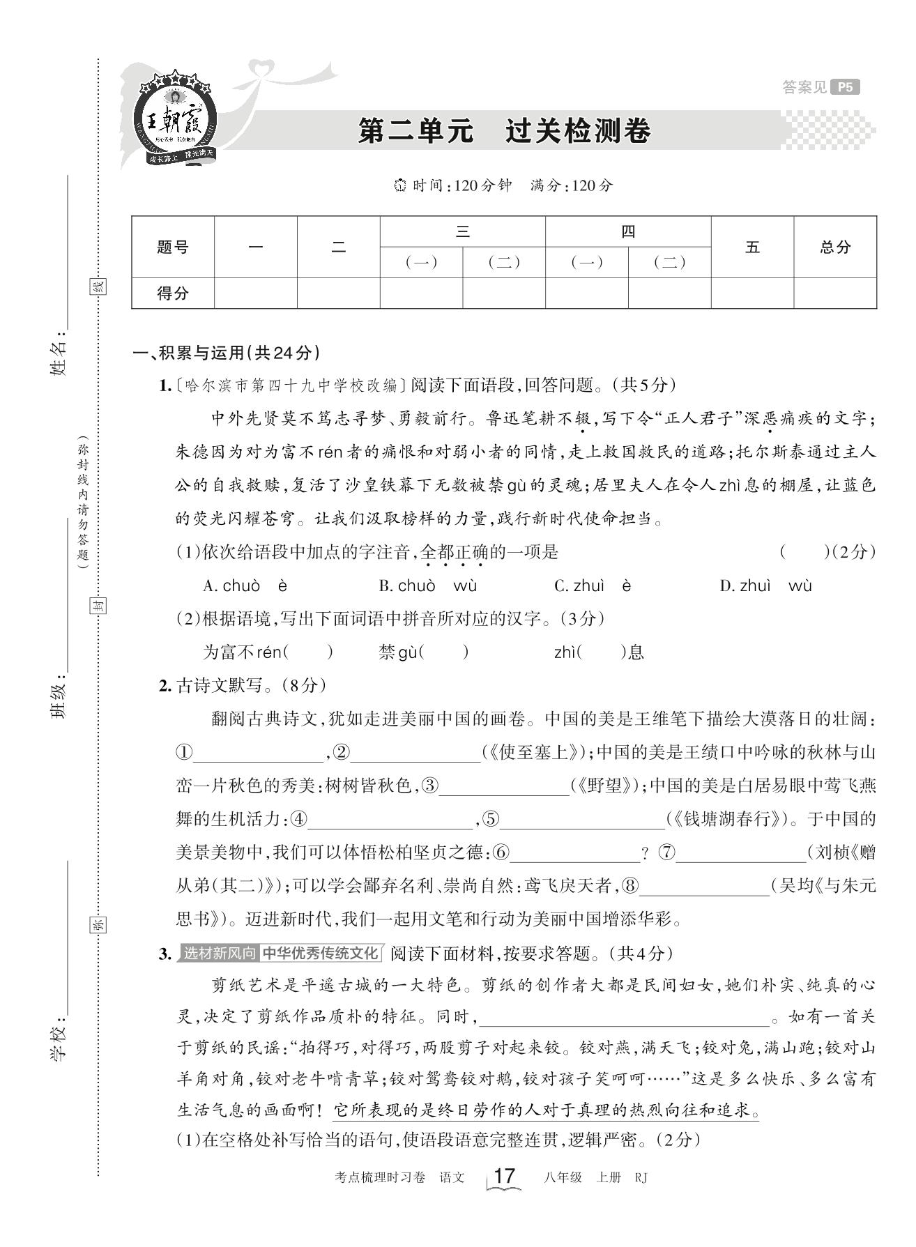 2023上册八年级语文人教版 第二单元 过关检测卷