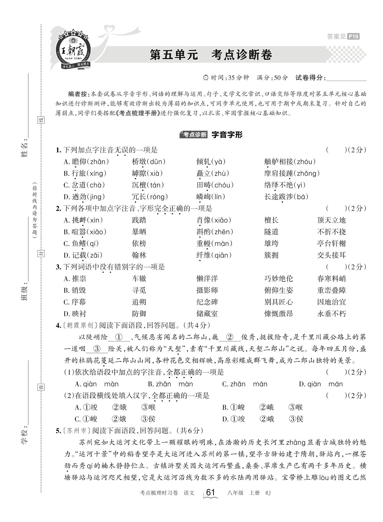 2023上册八年级语文人教版 第五单元 考点诊断卷