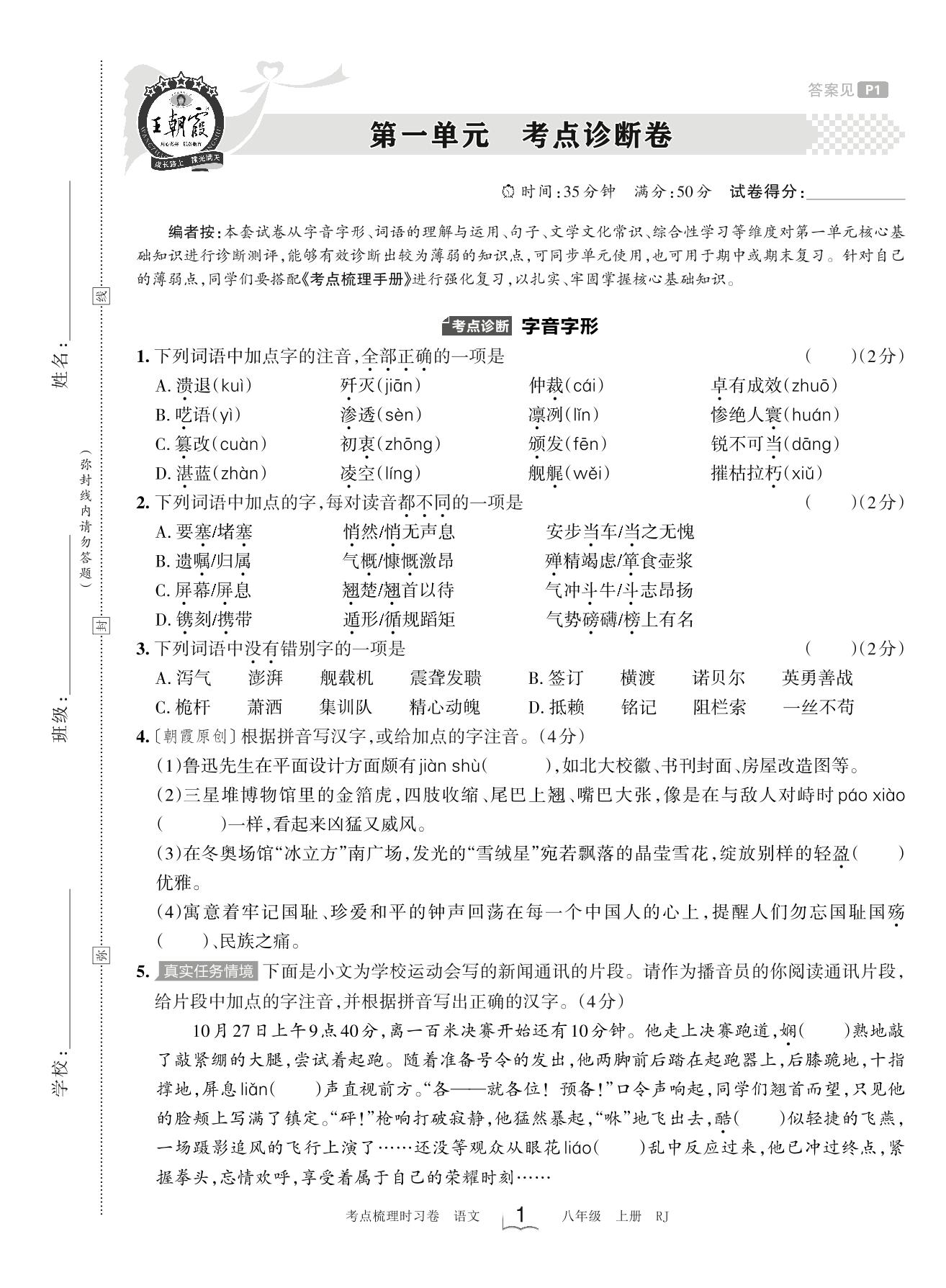 2023上册八年级语文人教版 第一单元 考点诊断卷