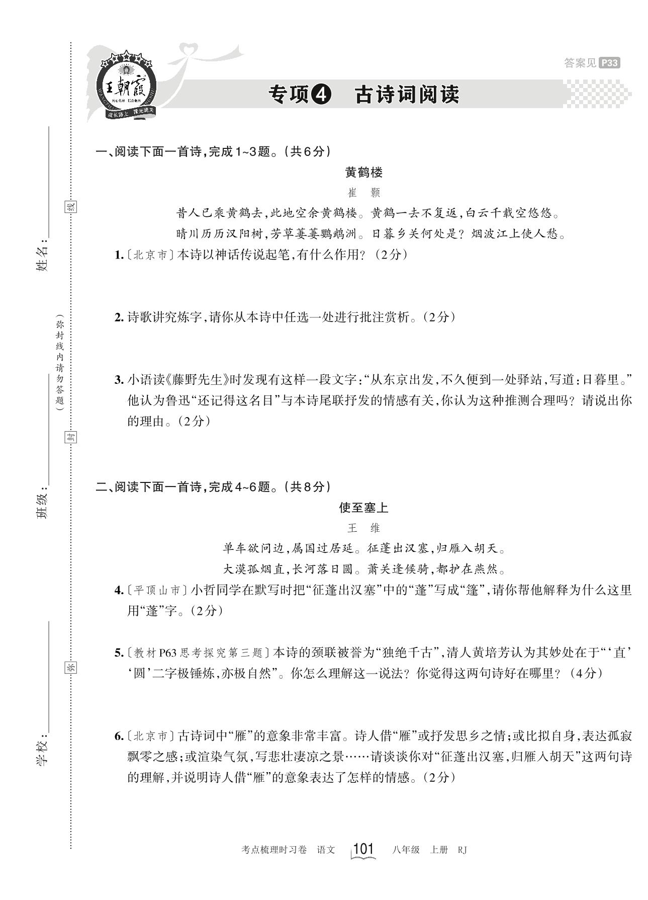 2023上册八年级语文人教版 专项4 古诗词阅读